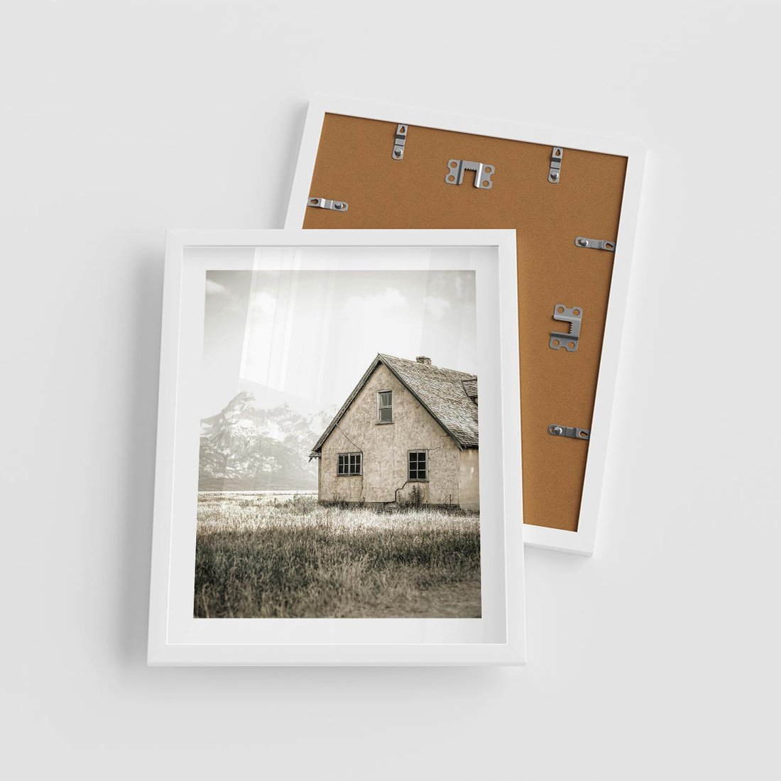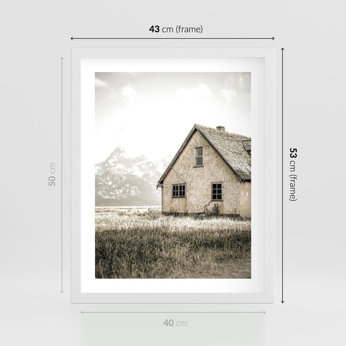 Plakat w ramie 40x50 - Ciepła Atmosfera - dom, stary dom w górach - rama biała