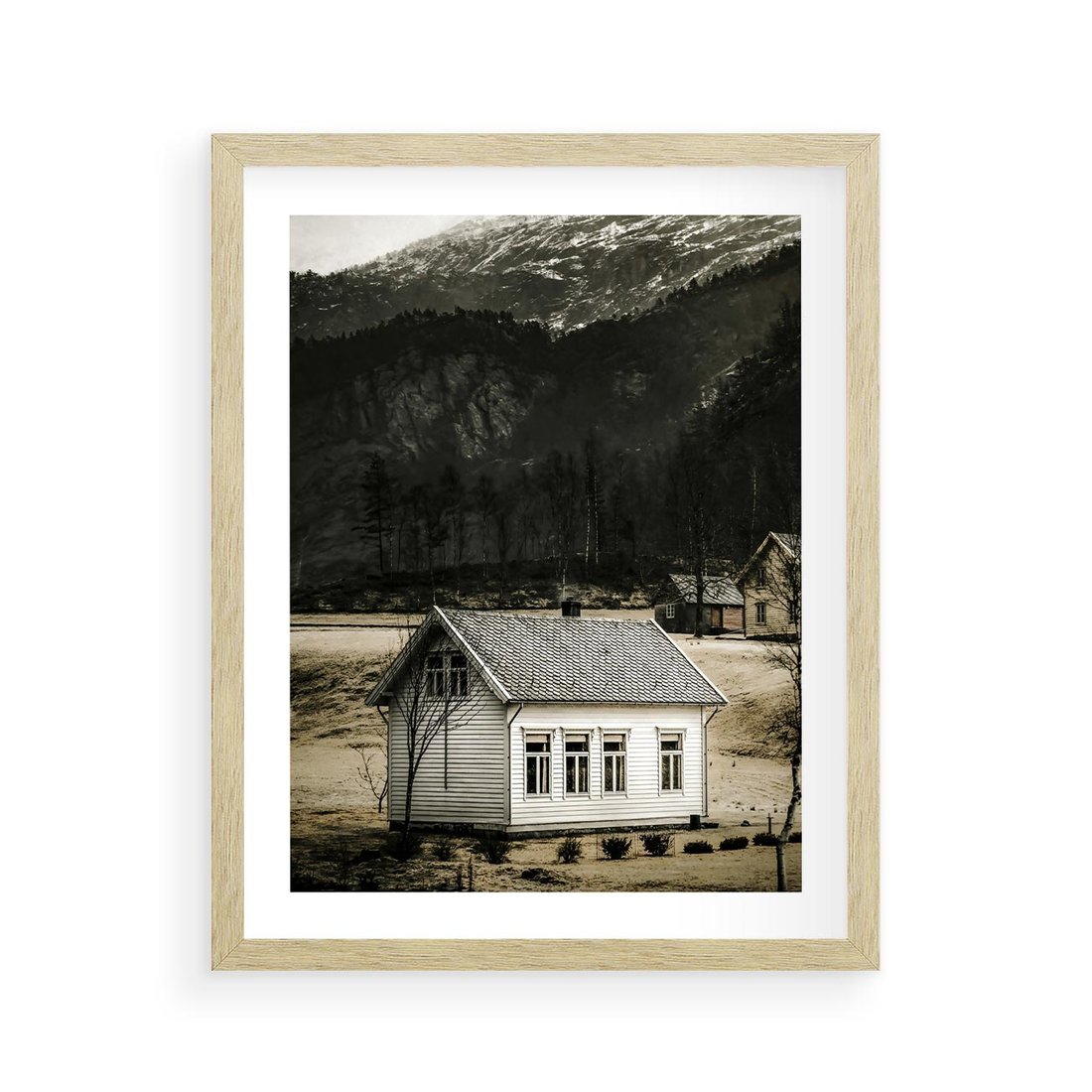 Obraz przedstawia domek w górach utrzymany w odcieniach sepii. Ta kompozycja nadaje wnętrzom klasyczną i nostalgiczna atmosferę.
