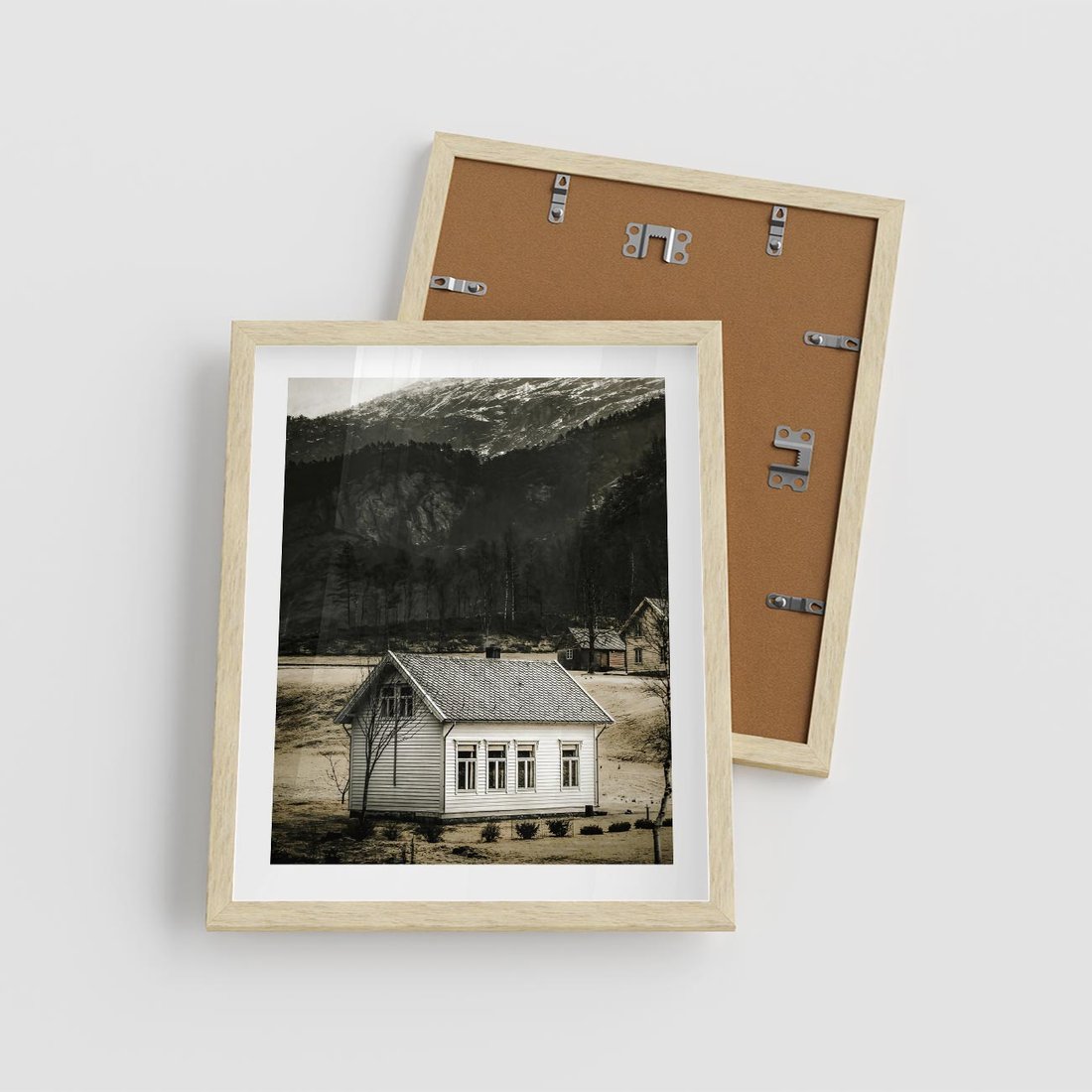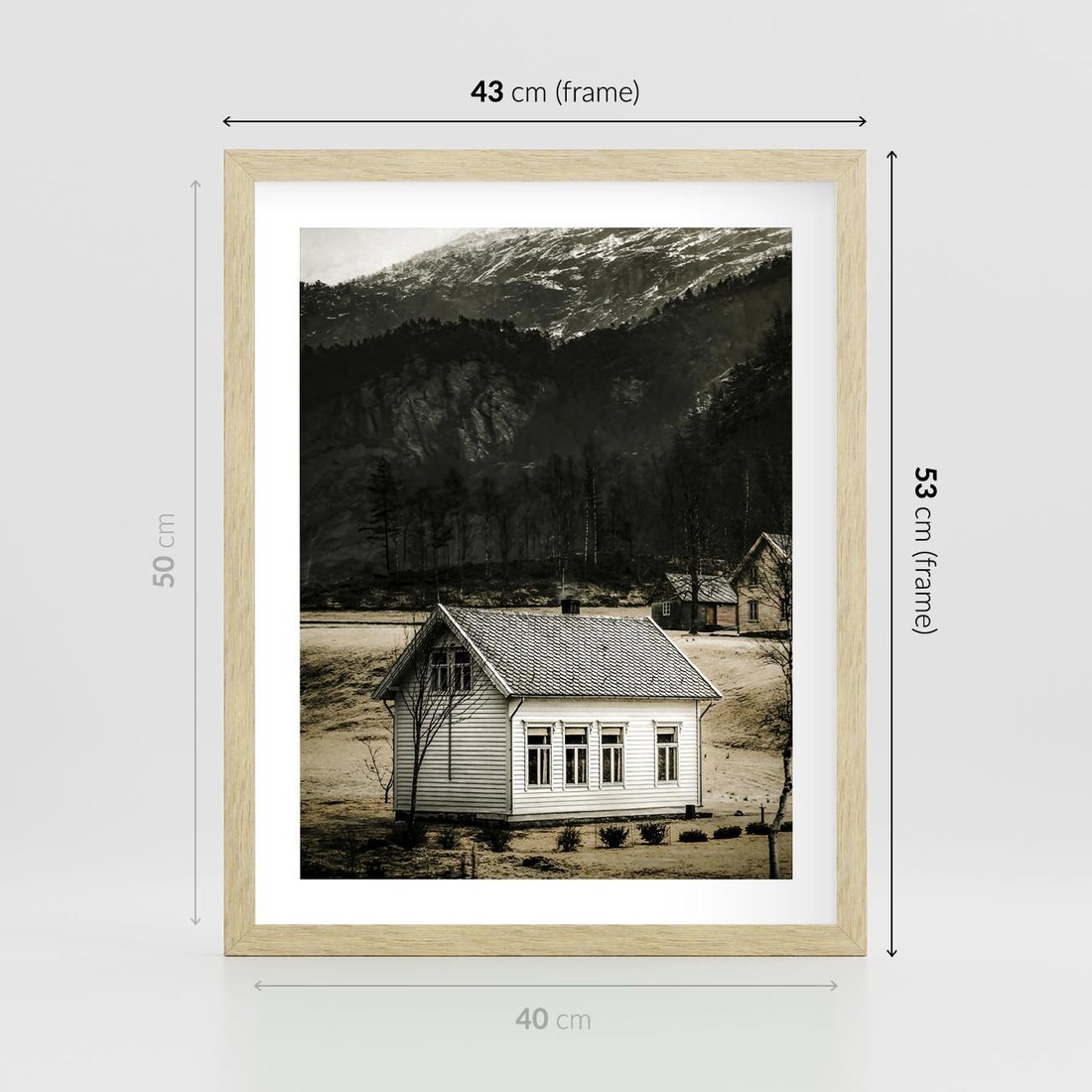 Plakat w ramie 40x50 - Ciepło i Urok Górskiego Domku - domek w górach, sepia - rama drewno