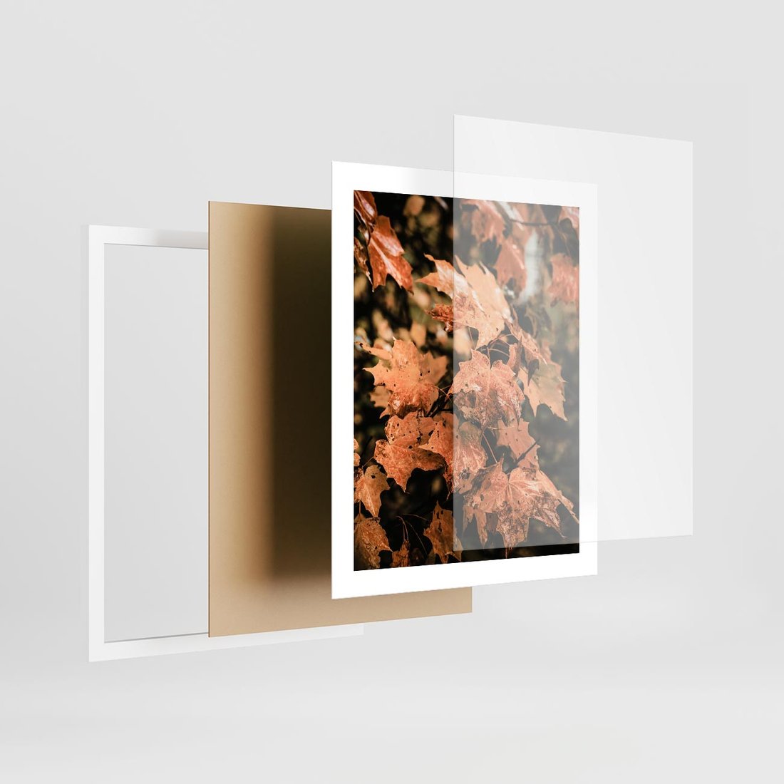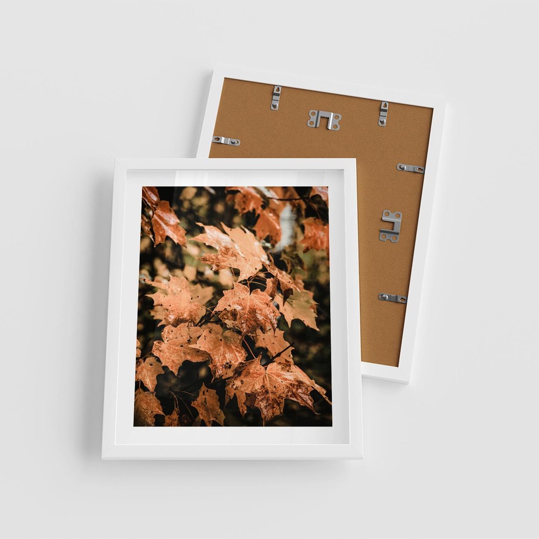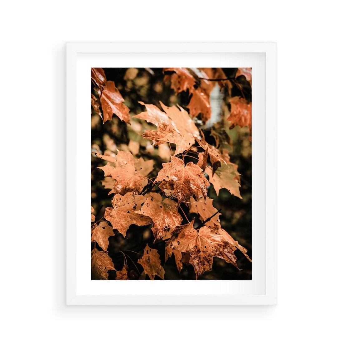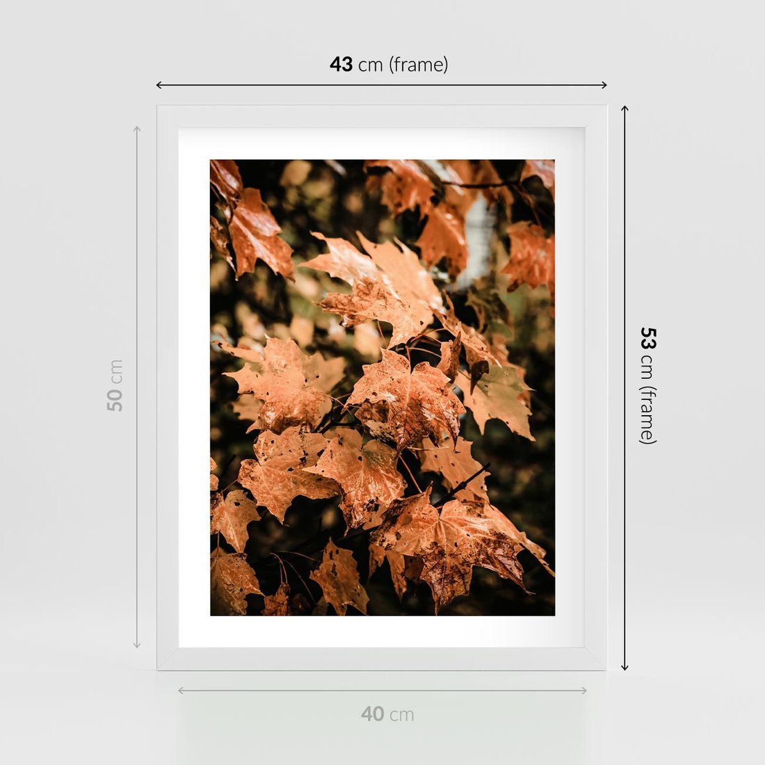 Plakat w ramie 40x50 - Ciepło Jesieni - jesienne pomarańczowe liśćie, jesień - rama biała