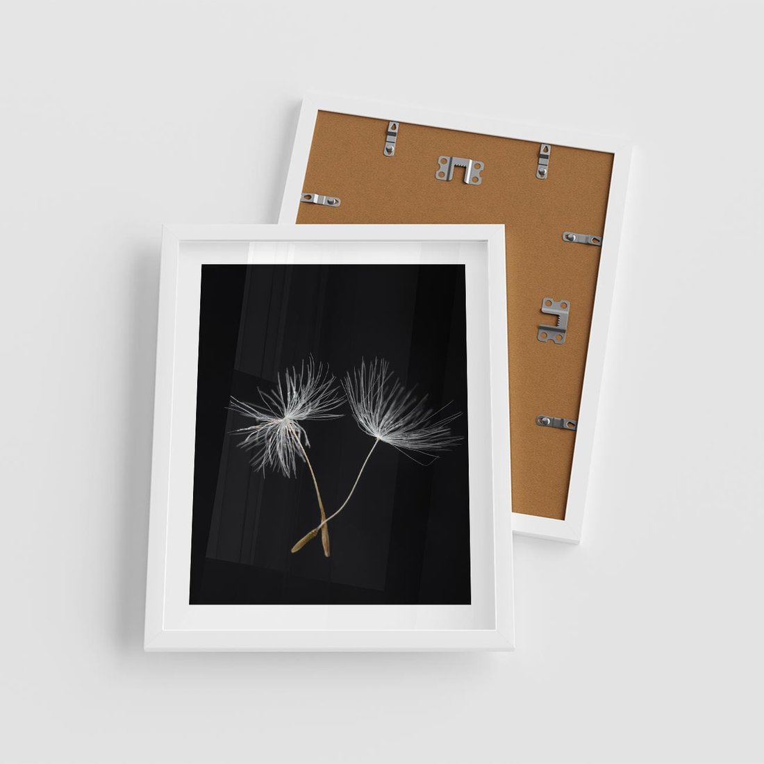 Plakat w ramie 40x50 - Delikatność Wiatru - dmuchawce, makro - rama biała