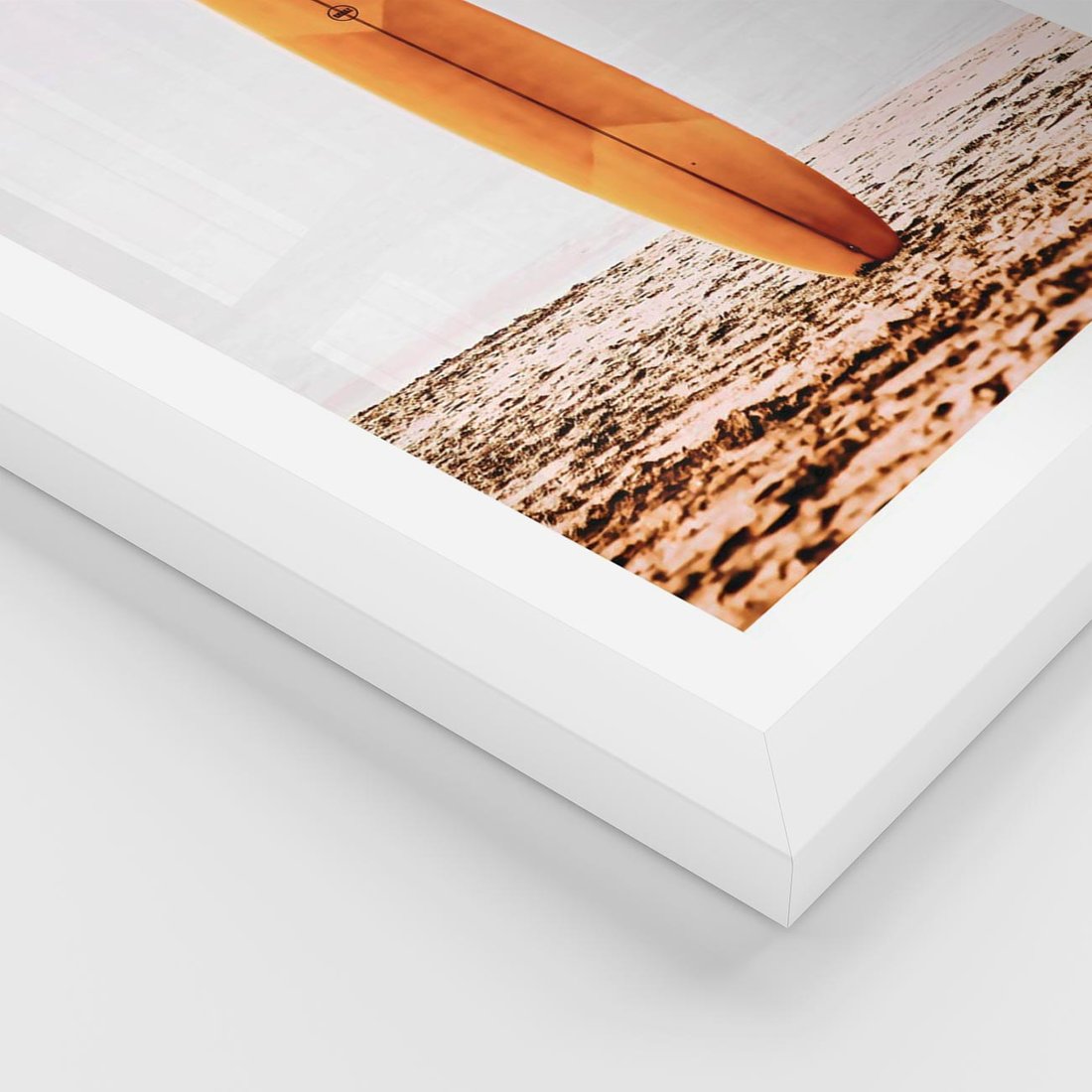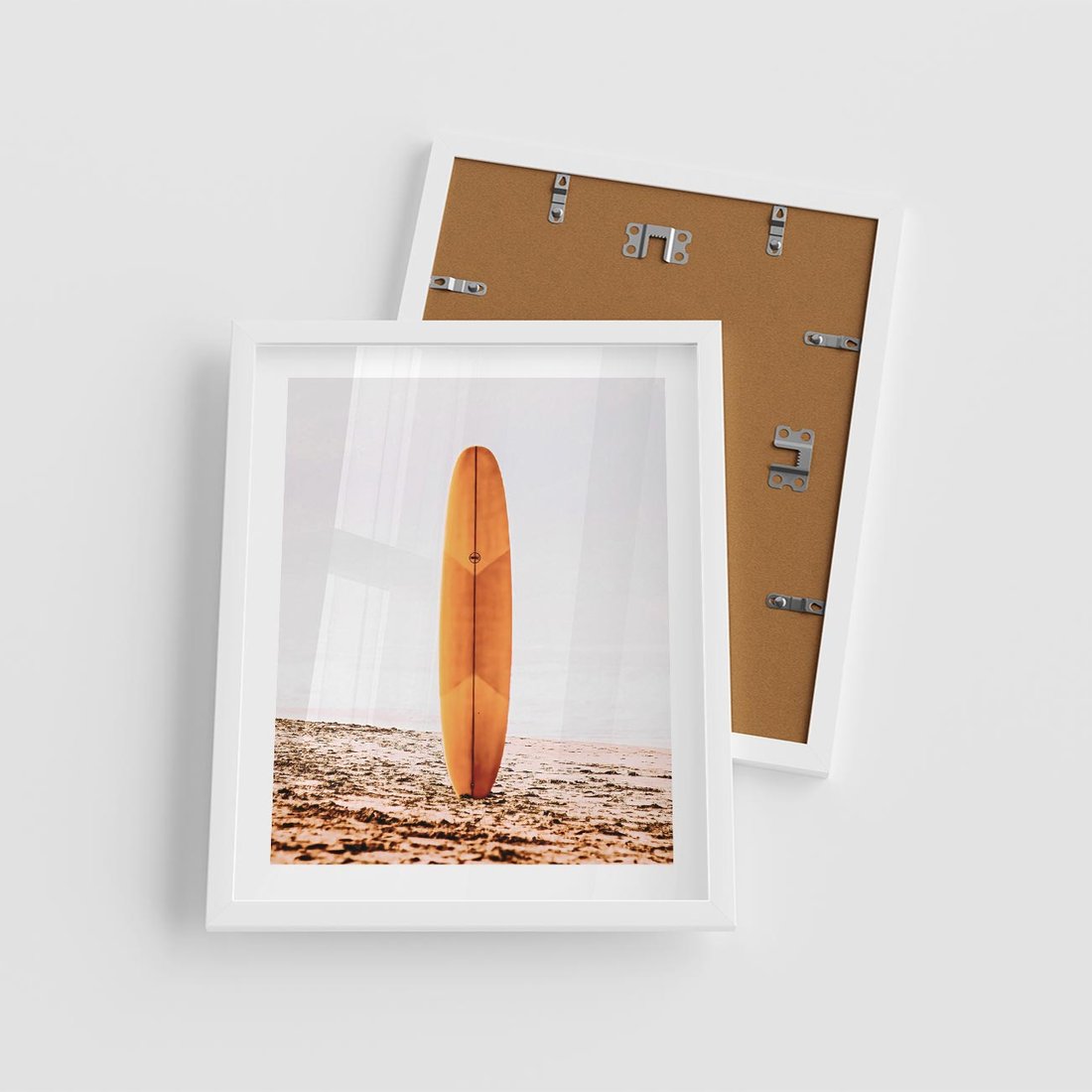 Plakat w ramie 40x50 - Deska w Piasku: Gotowa na Fale - plaża, pomarańczowa deska surfingowa wbita w piasek - rama biała