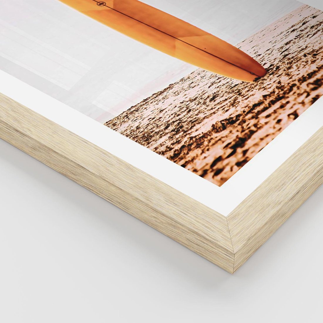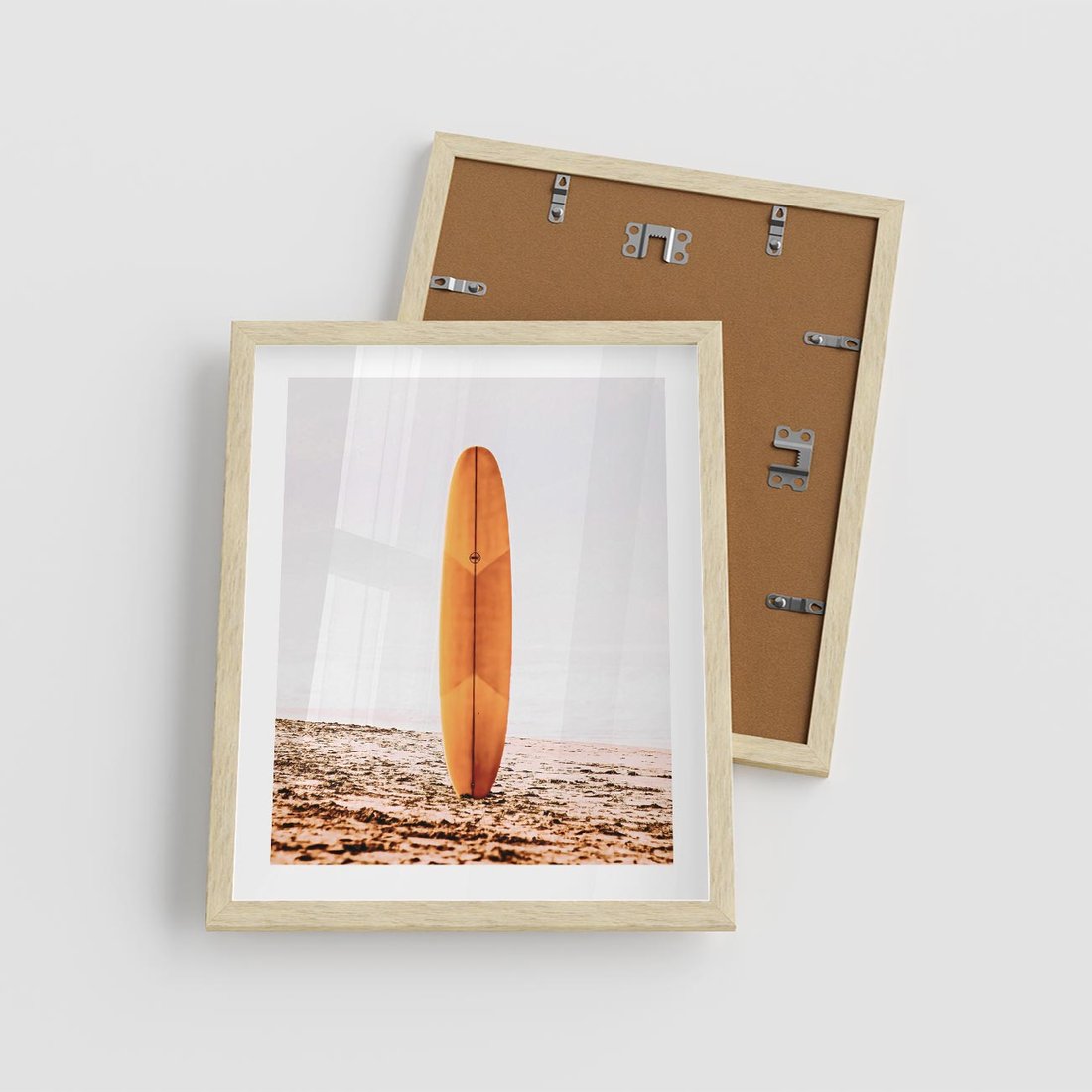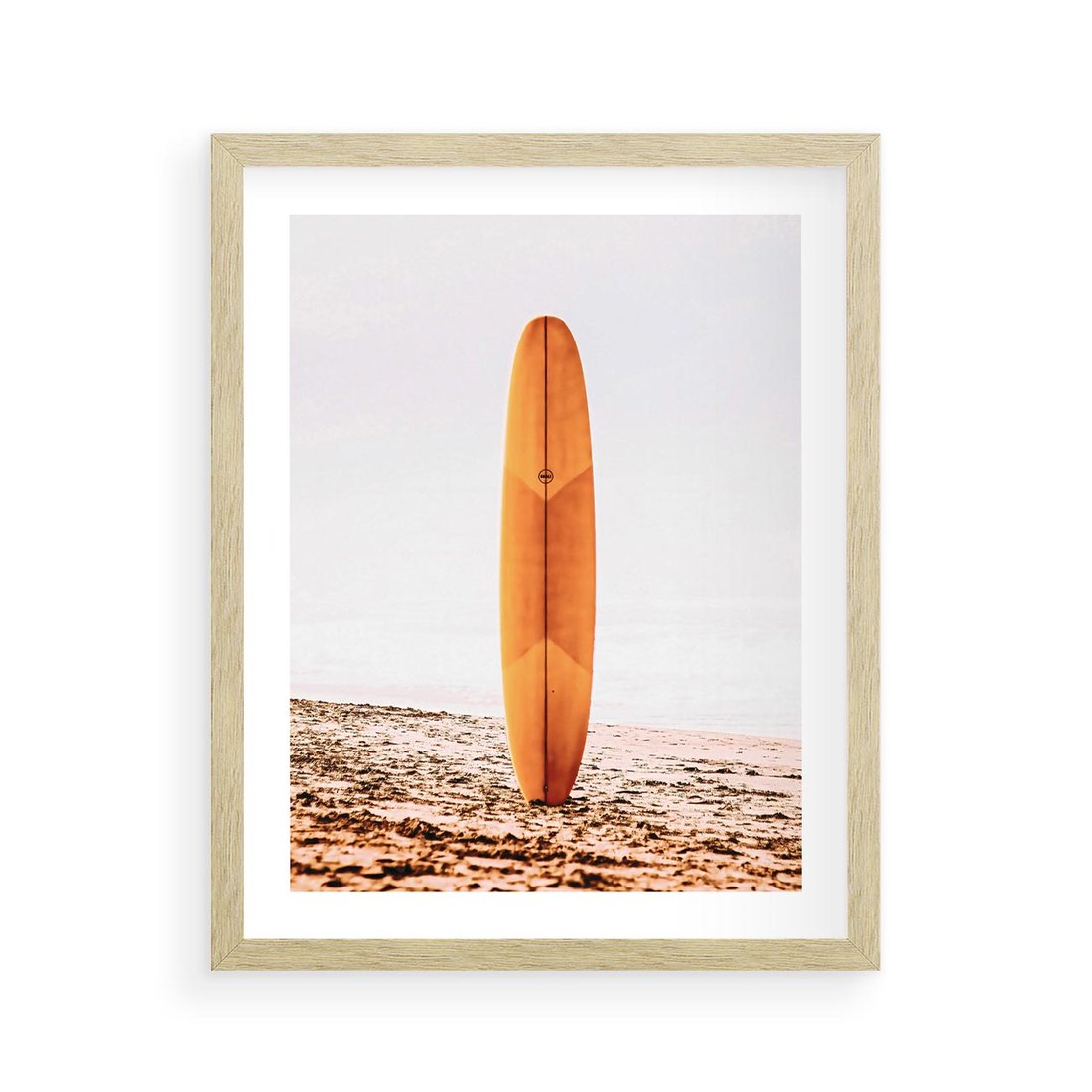 Plakat w ramie 40x50 - Deska w Piasku: Gotowa na Fale - plaża, pomarańczowa deska surfingowa wbita w piasek - rama drewno