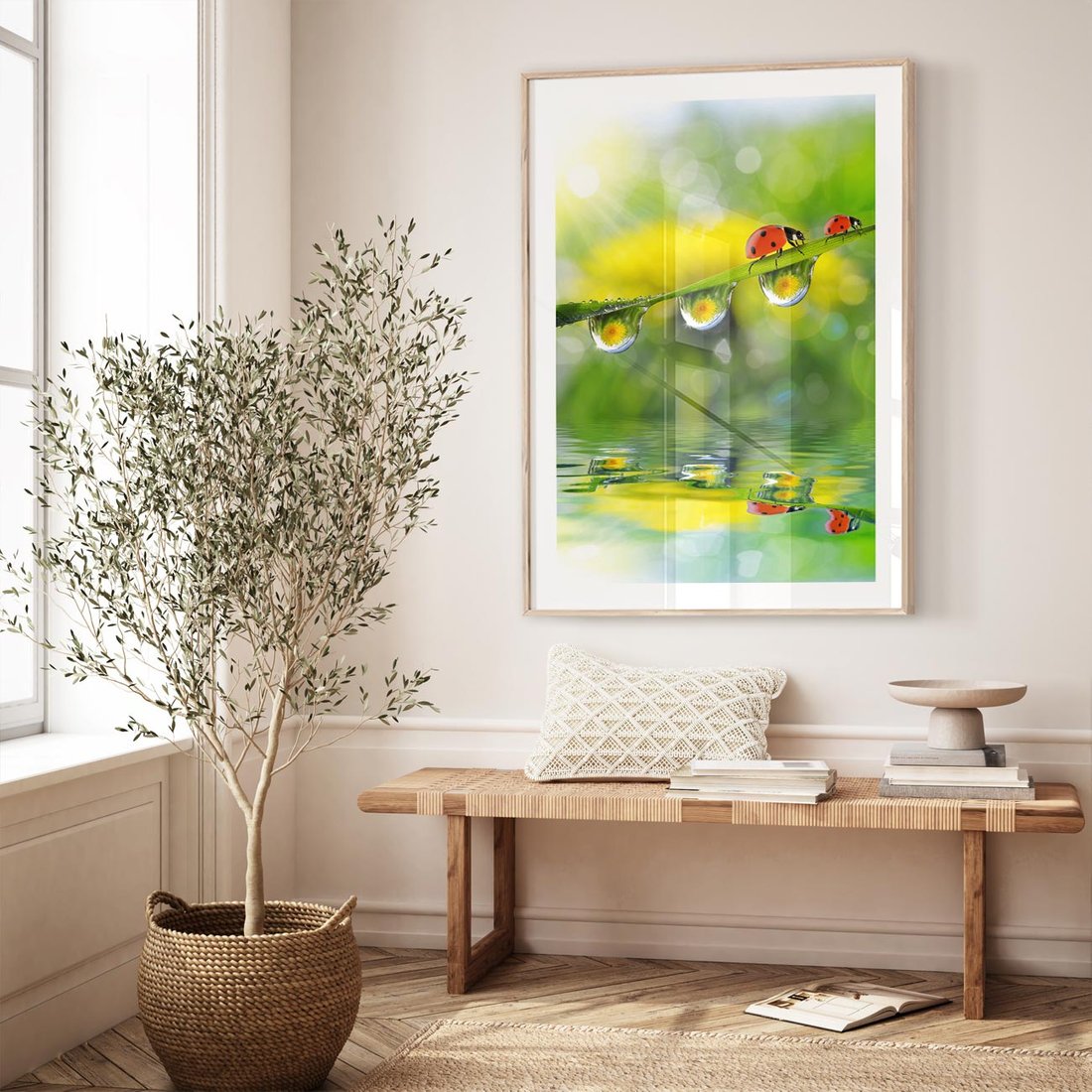 Złap chwilę deszczu wraz z tą obecną biedronką. Kontrastujące kolory, krople deszczu i delikatne detale tworzą niezwykłą aurę. Idealny dla miłośników natury i tych, którzy pragną wprowadzić do swojego wnętrza nutę harmonii i spokoju.