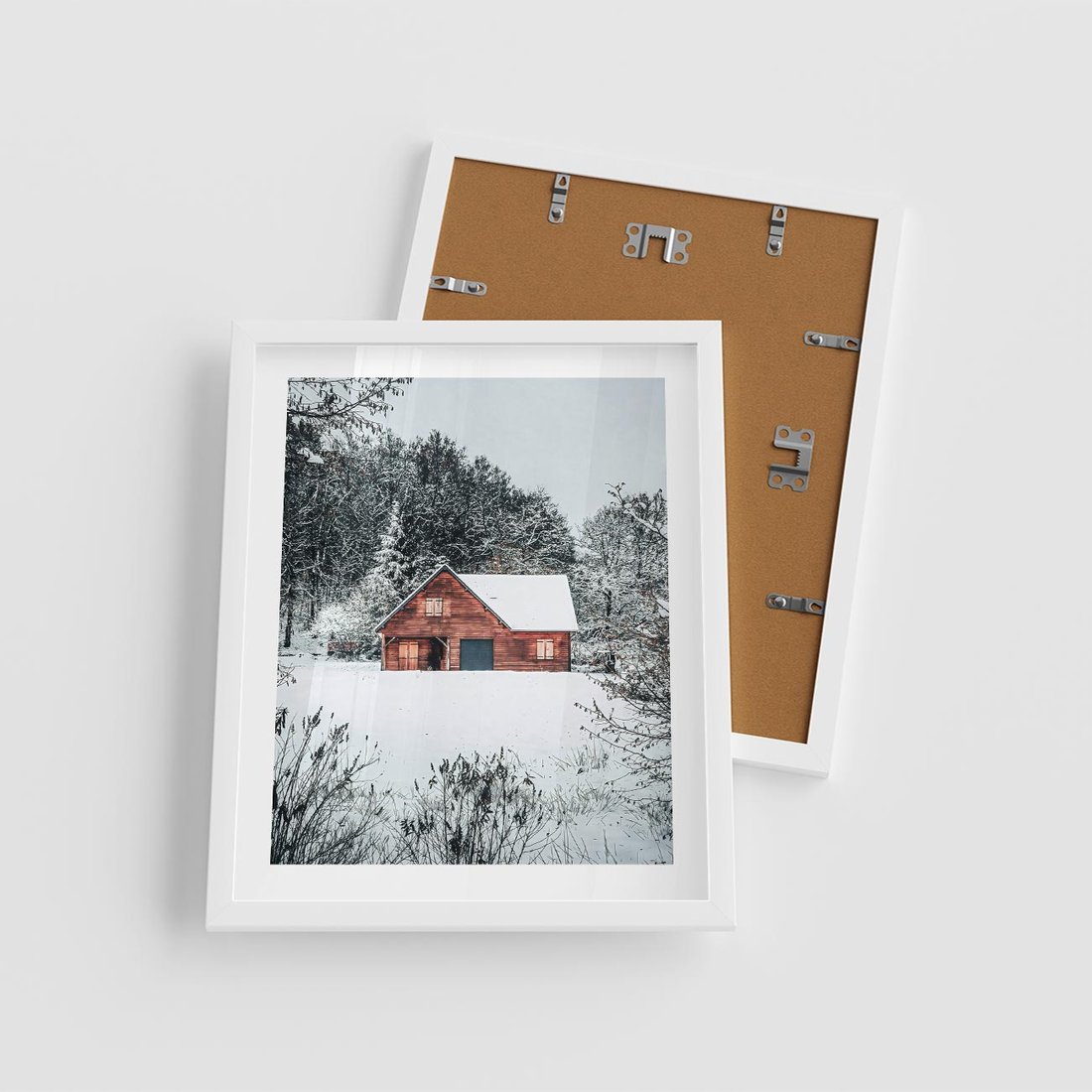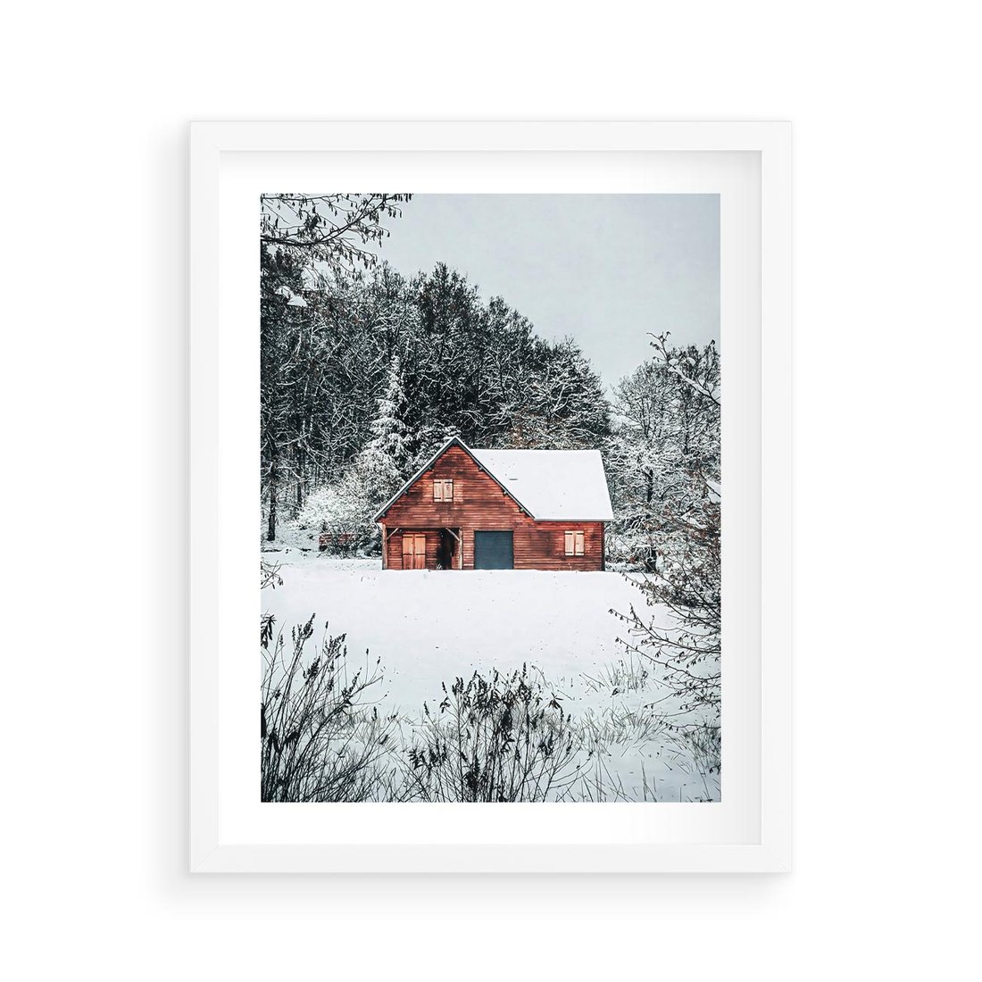 Plakat w ramie 40x50 - Domek w Górach Pokryty Śniegiem - domek w górach, śnieg - rama biała