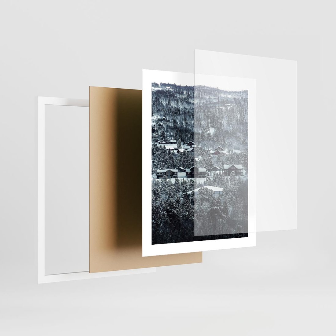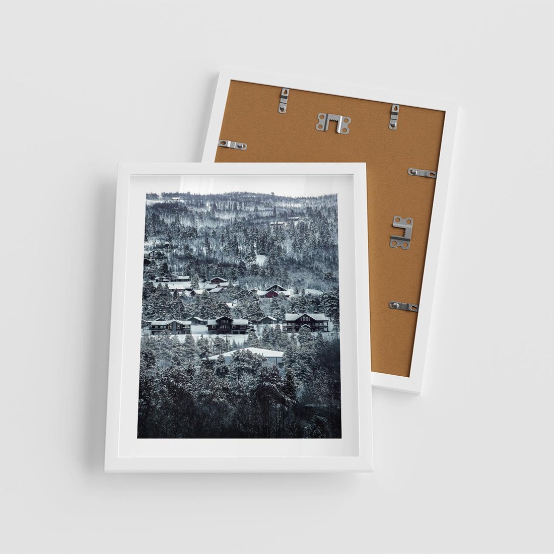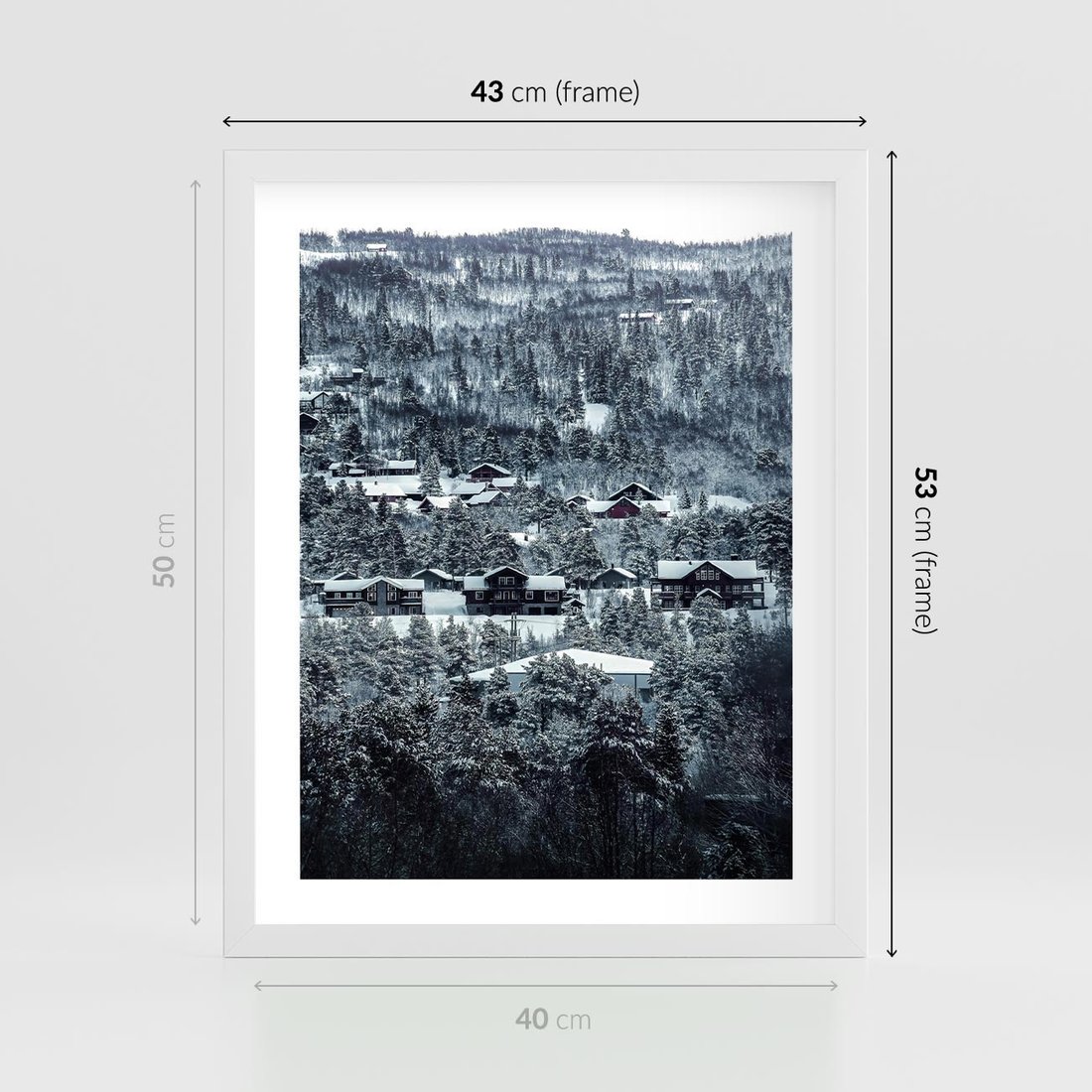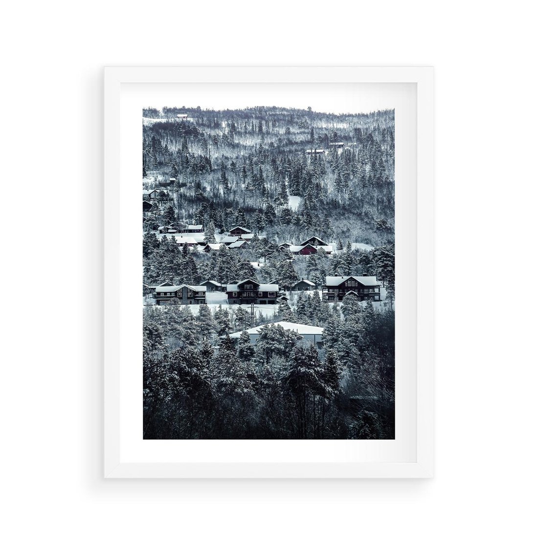 Plakat w ramie 40x50 - Domki w Chmurach - górski zimowy krajobraz, dommki na wzgórzach - rama biała