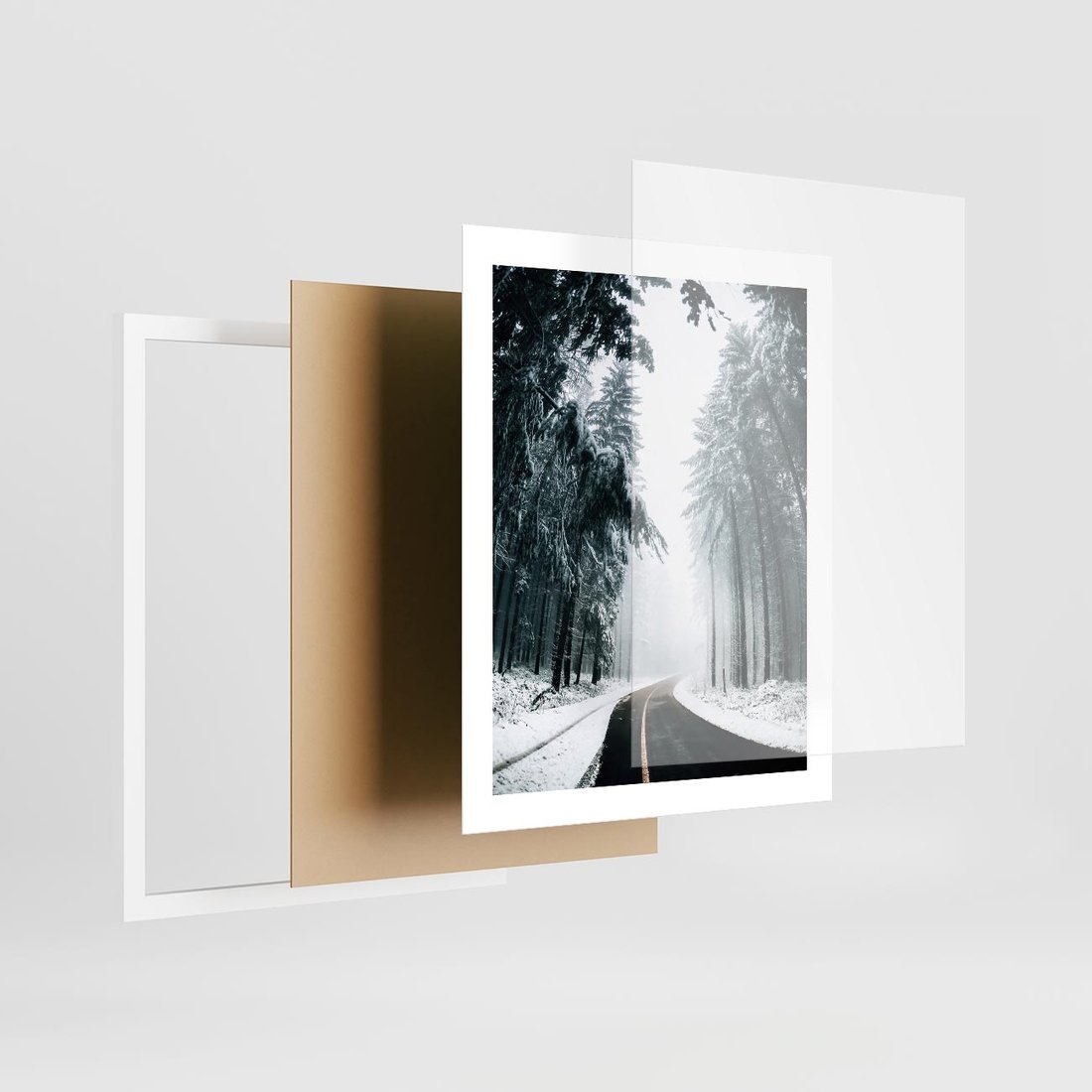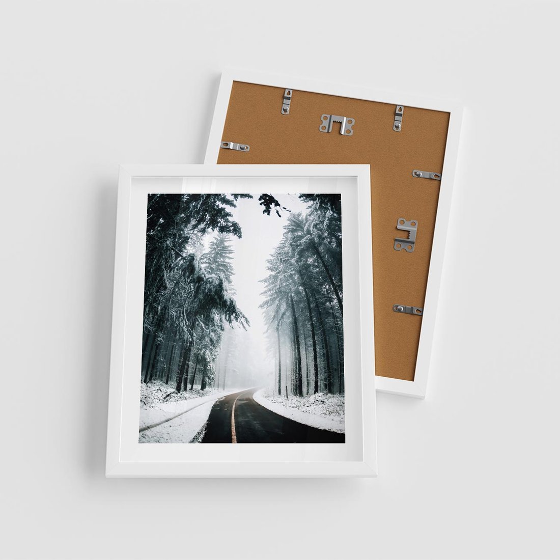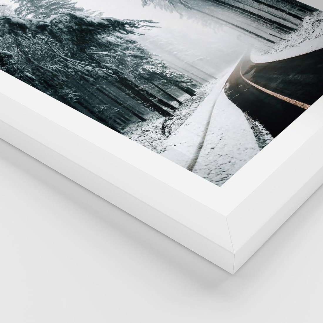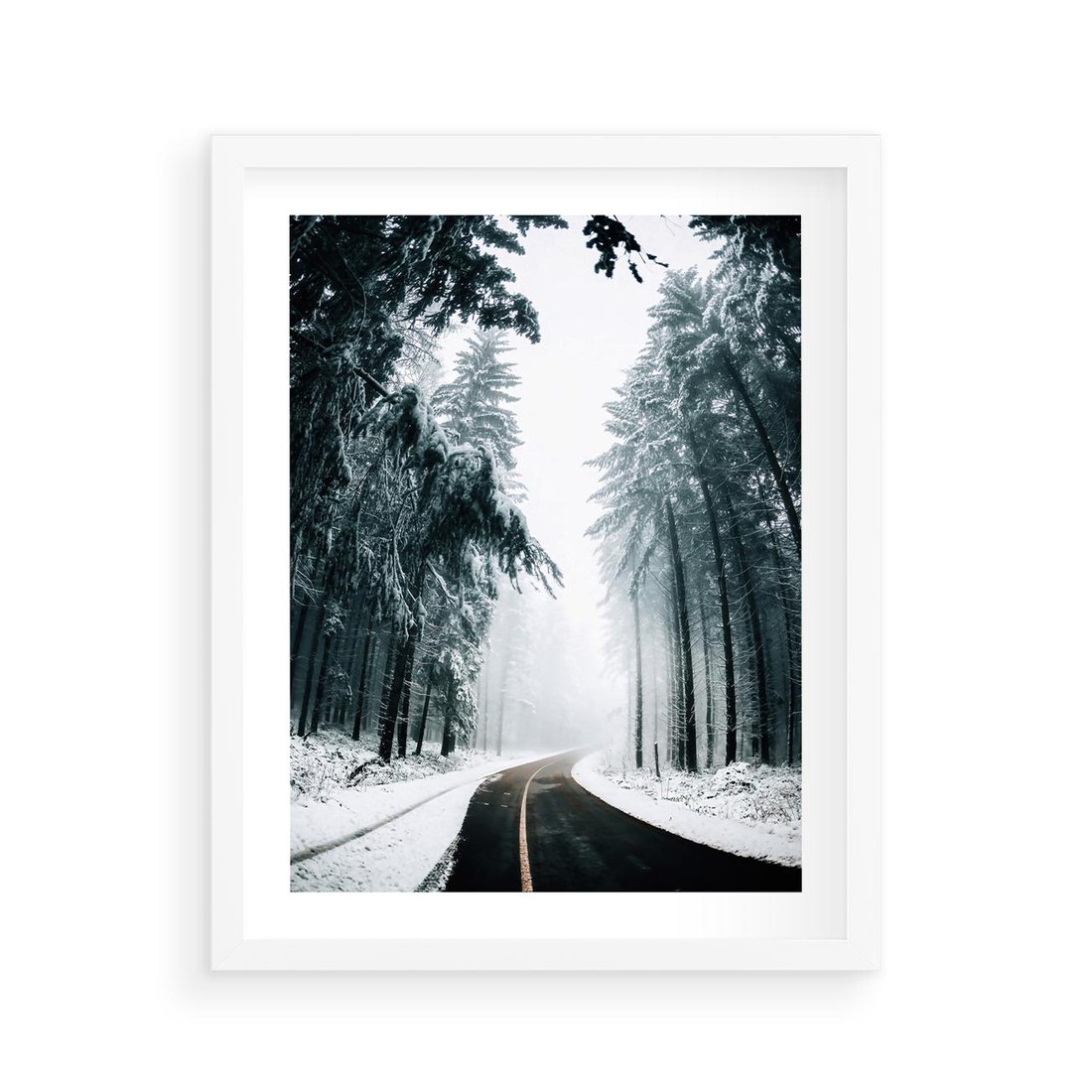 Plakat w ramie 40x50 - Droga przez Zimowy Las - drzewa, śnieg - rama biała