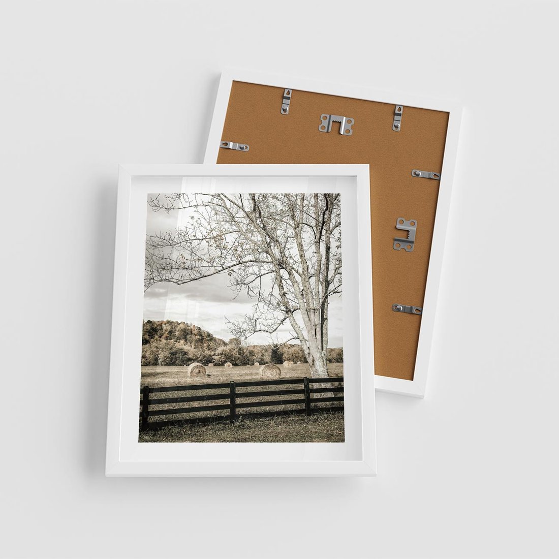 Plakat w ramie 40x50 - Drzewa i Snopki Siana - farma, drzewa - rama biała