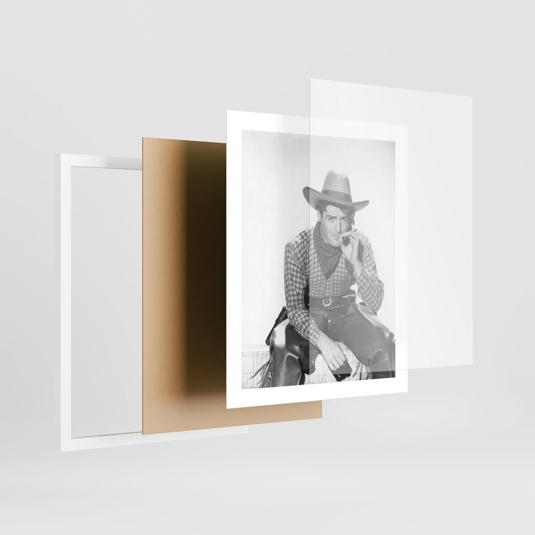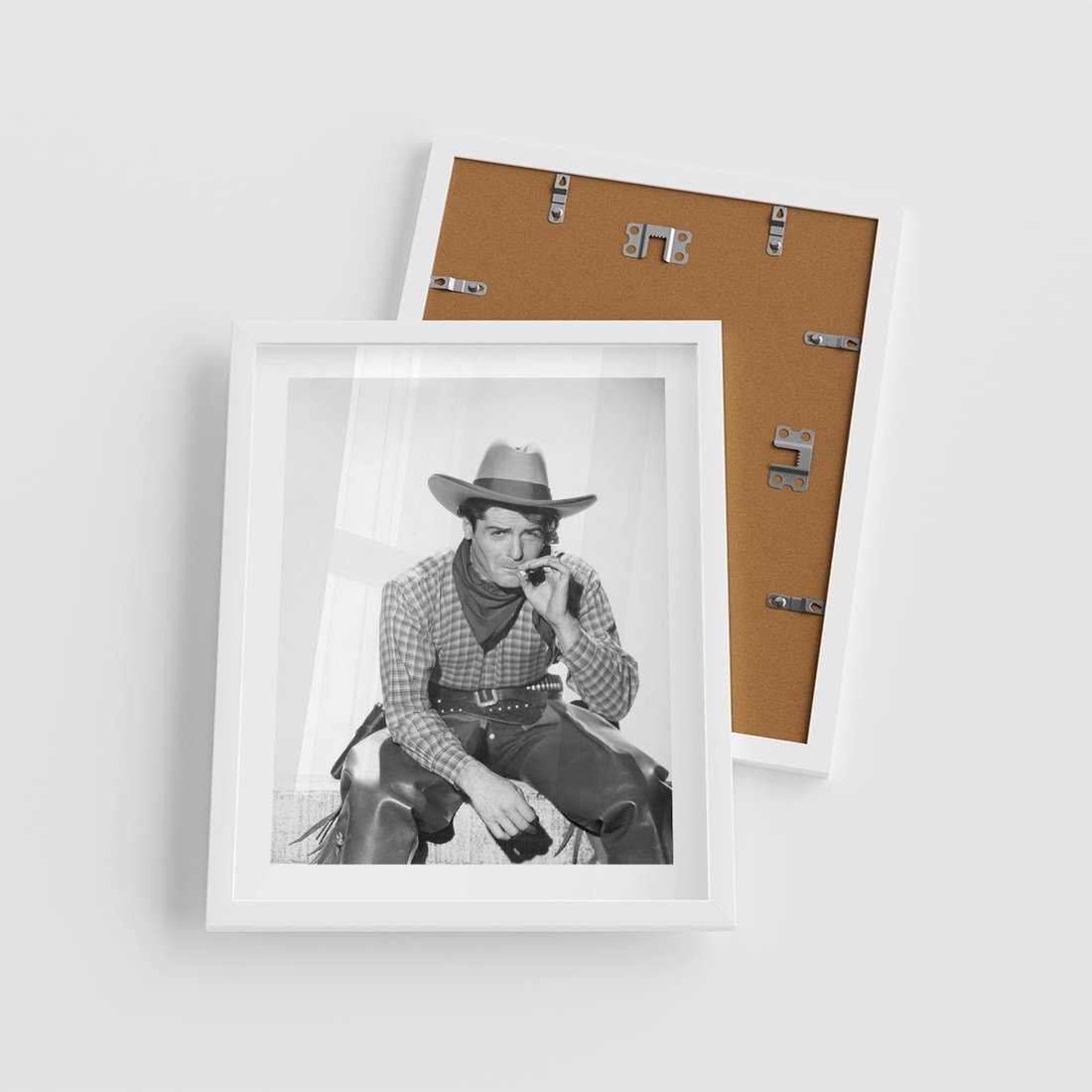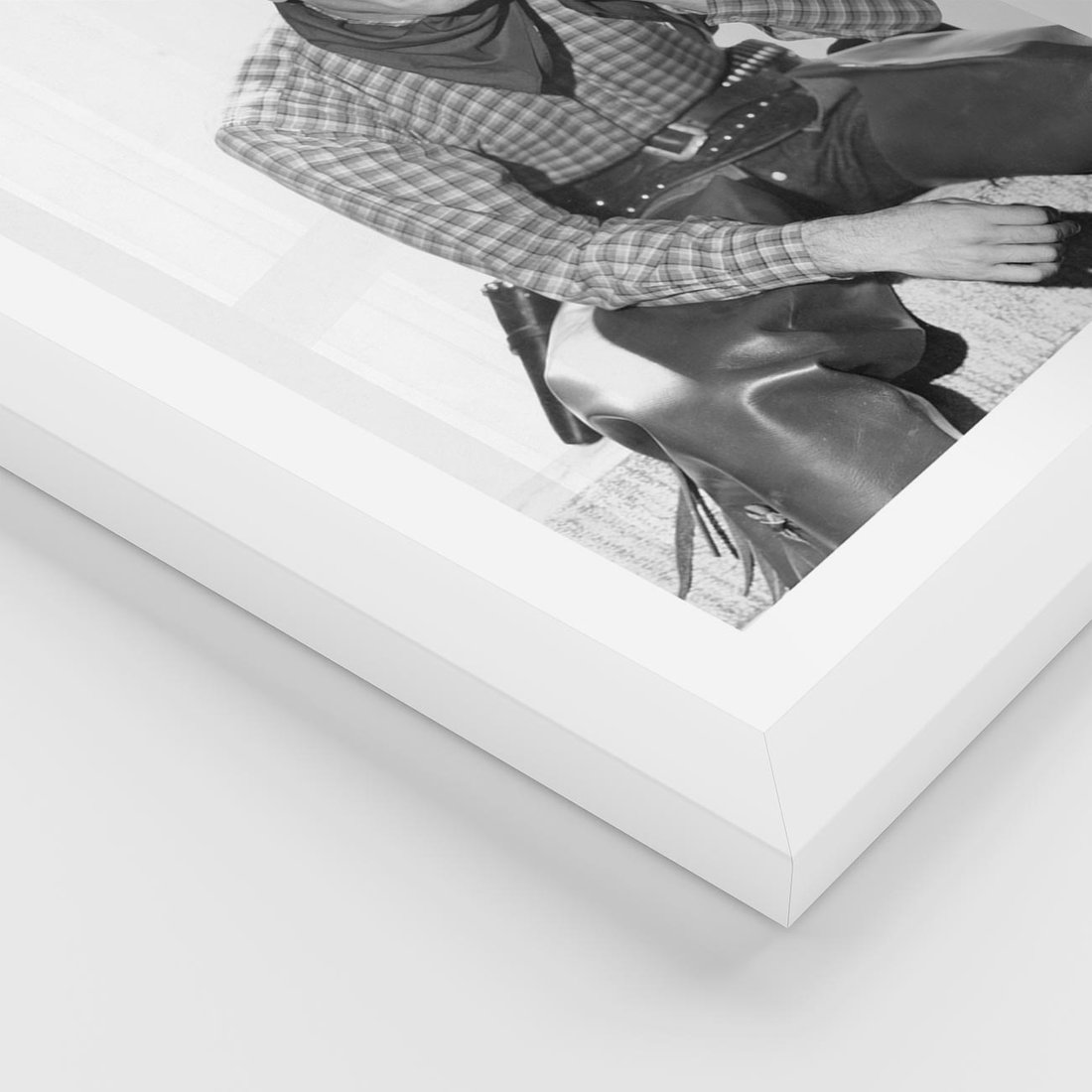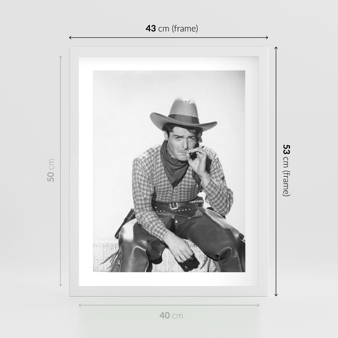 To czarno-białe retro zdjęcie ukazuje mężczyznę w kowbojskim stylu. Jest to hołd dla dziedzictwa kowbojskiego i epoki westernu. Zdjęcie emanuje męską siłą i niezależnością, przywołując obrazy rozległych preriów, koni i przygód na Dzikim Zachodzie. Idealnie nadaje się jako ozdoba dla miłośników westernu i fanów stylu retro.