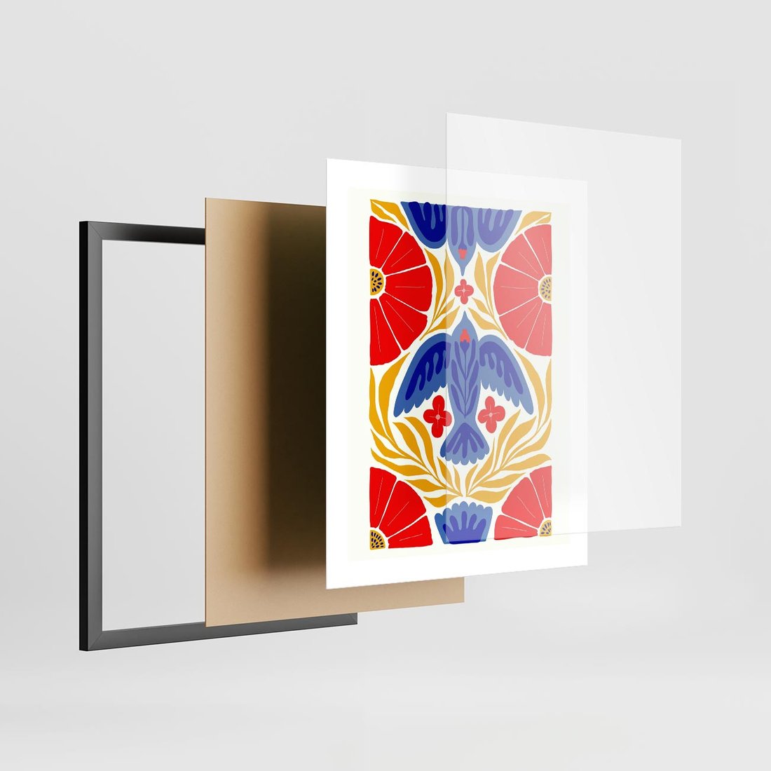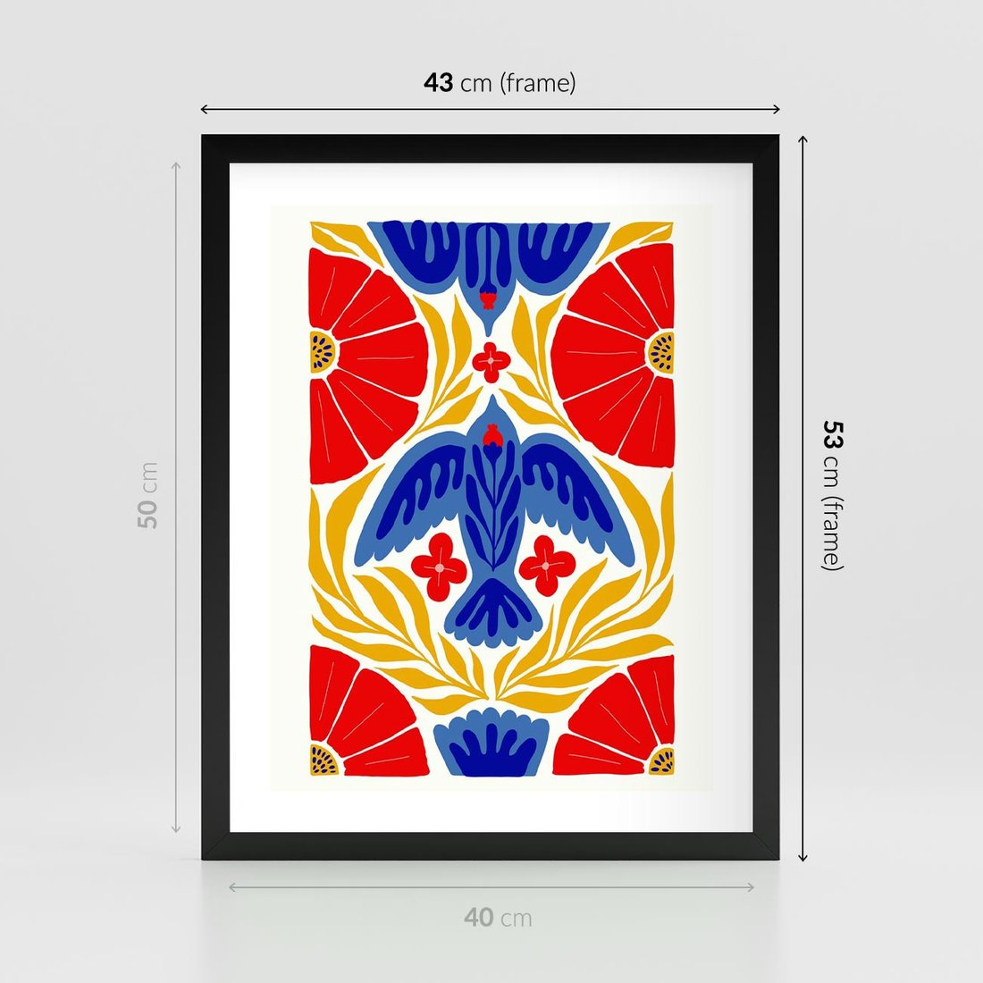 Wyrazista grafika ożywa mocnymi barwami czerwieni, niebieskiego i żółtego. Centralny ptak otoczony czerwonymi kwiatami tworzy dynamiczną kompozycję, która przyciąga wzrok i wzbudza emocje.