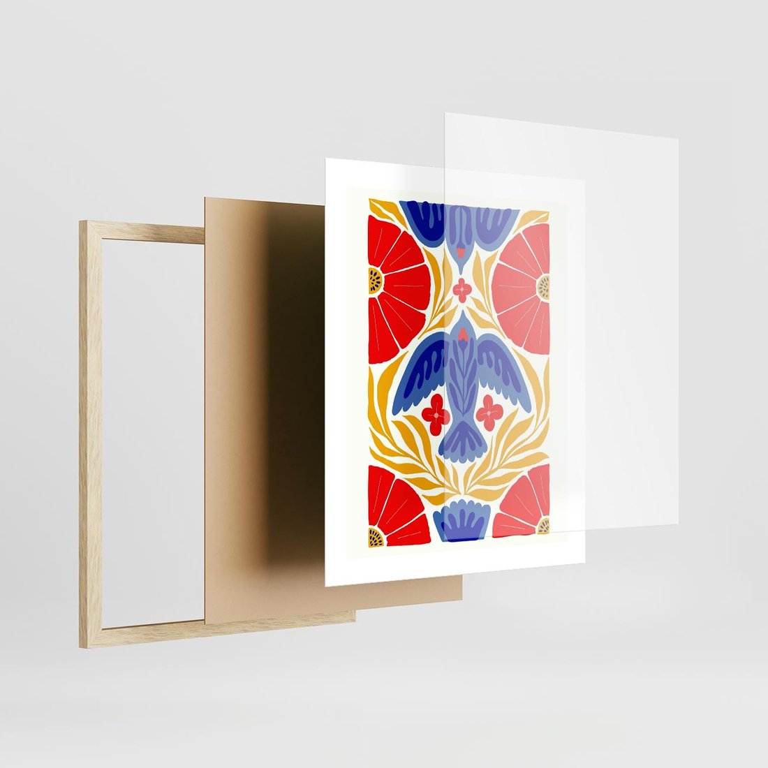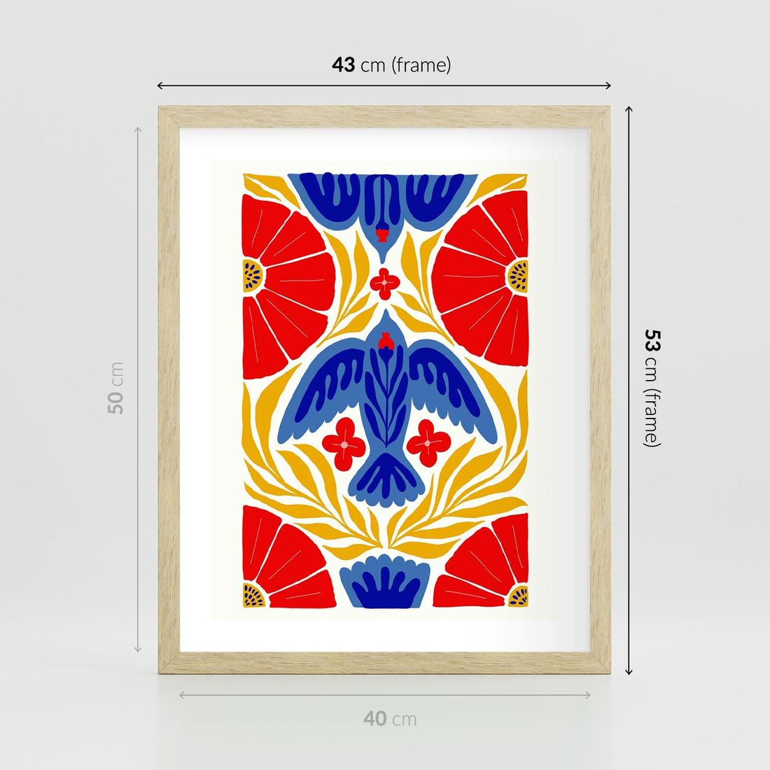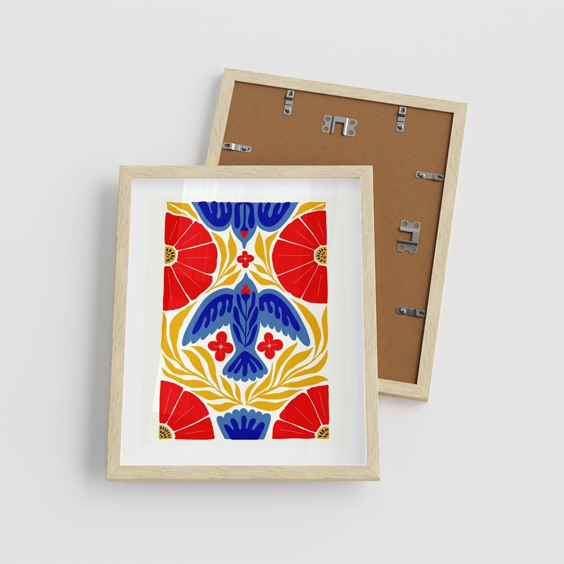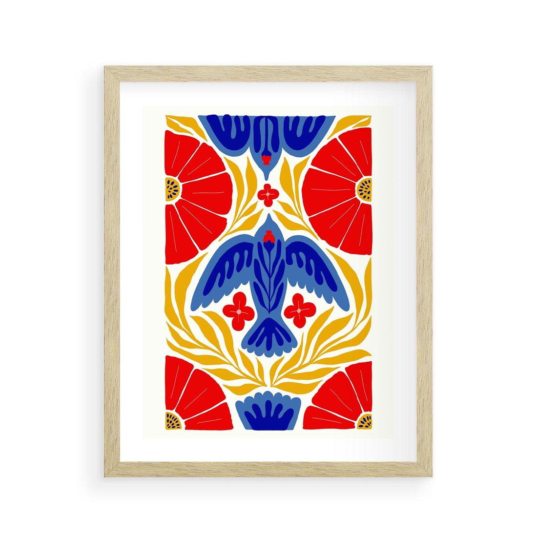 Wyrazista grafika ożywa mocnymi barwami czerwieni, niebieskiego i żółtego. Centralny ptak otoczony czerwonymi kwiatami tworzy dynamiczną kompozycję, która przyciąga wzrok i wzbudza emocje.