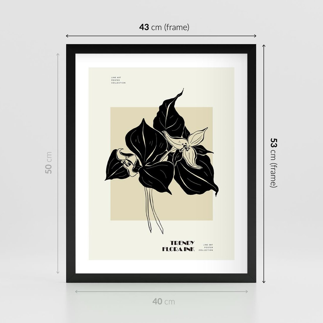 Elegancki minimalizm w połączeniu z kwiatową typografią. Monochromatyczne kolory i czarny kontur tworzą harmonijną kompozycję. Ten obraz przynosi do wnętrza subtelny akcent natury i estetycznej prostoty.