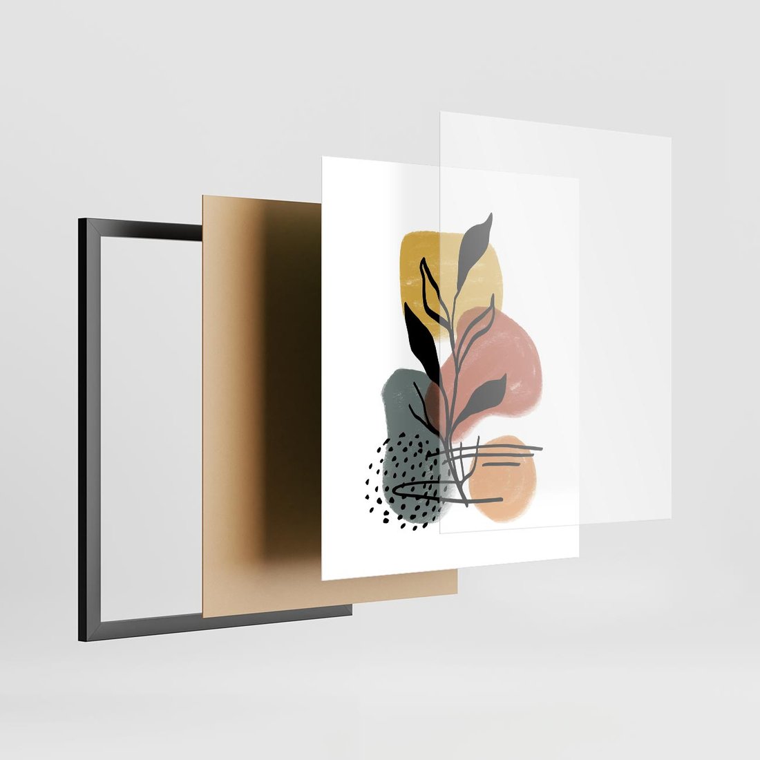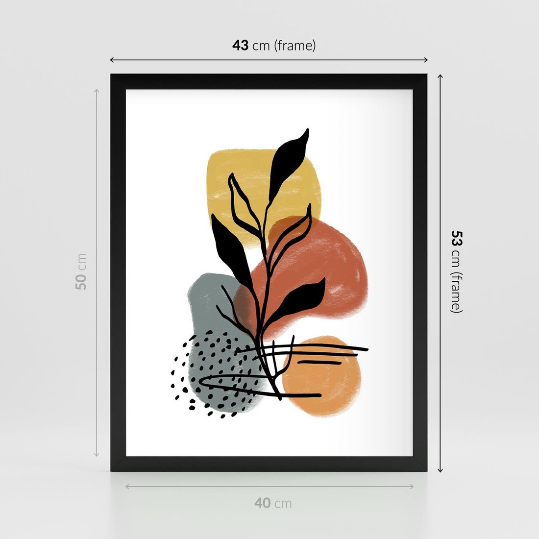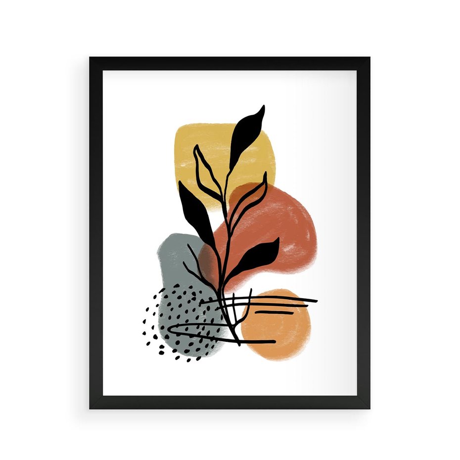 Nasza nowoczesna sztuka to abstrakcja, w której czarny szkic elementów roślinnych łączy się z akwarelowymi plamami. To unikalne połączenie przynosi do Twojej przestrzeni artystyczną ekspresję i dynamikę, tworząc kompozycję pełną wyrazu i kontrastu.