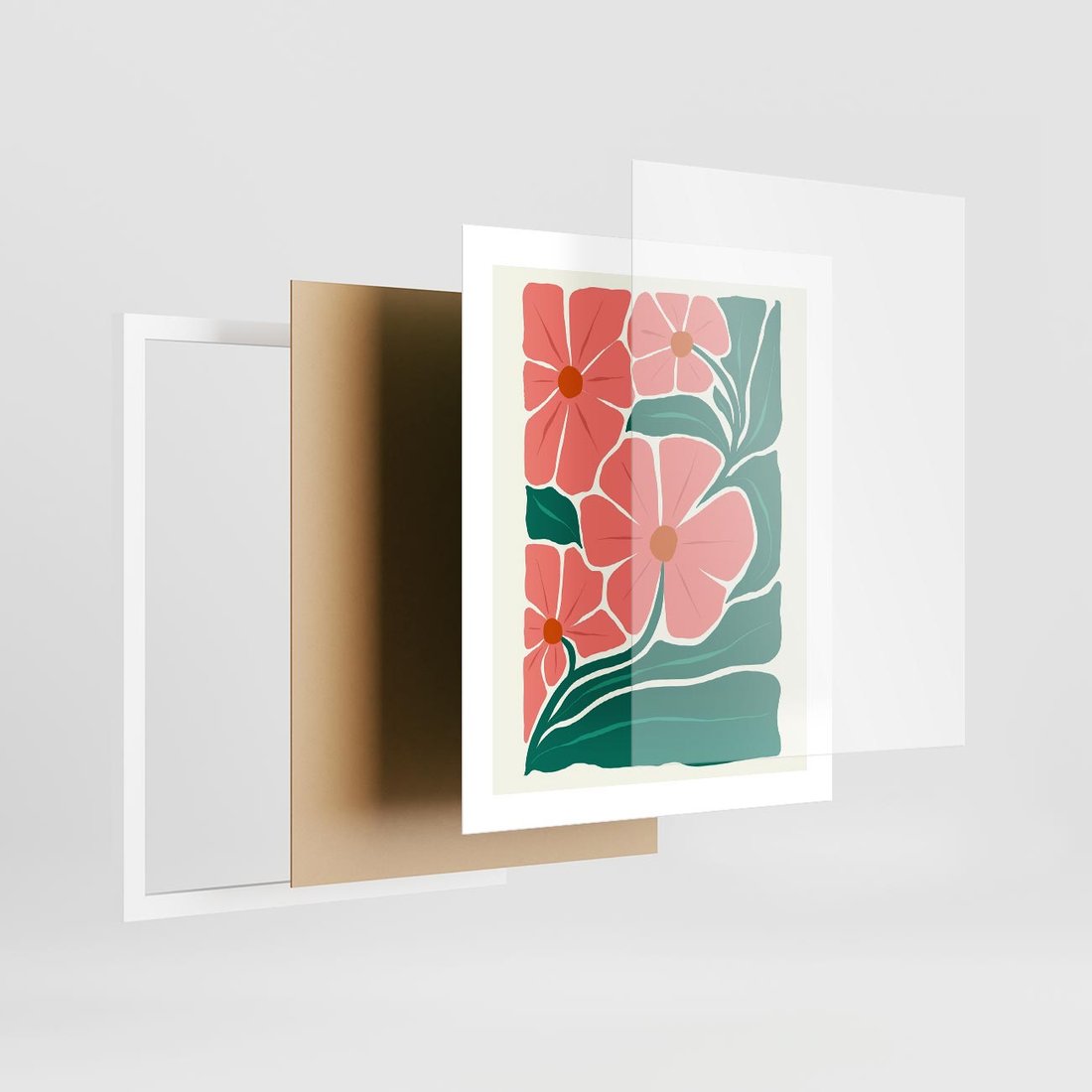 Ten plakat w minimalistycznym stylu przenosi nas w świat delikatnych kwiatów, ukazanych w pastelowej paletcie. Sztuka nowoczesna w swojej najczystszej formie, tworząca spokojną i urokliwą atmosferę.