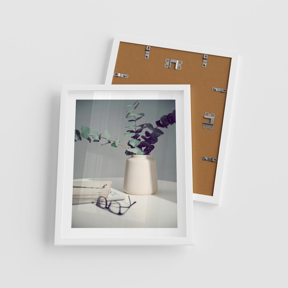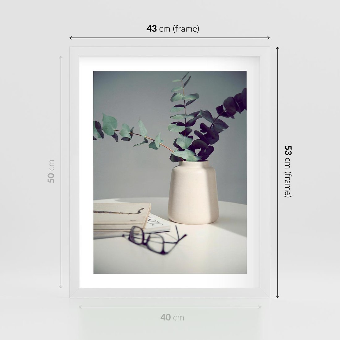 Plakat w ramie 40x50 - Eukaliptusowa Cisza - kompozycja, liście eukaliptusa w wazonie - rama biała