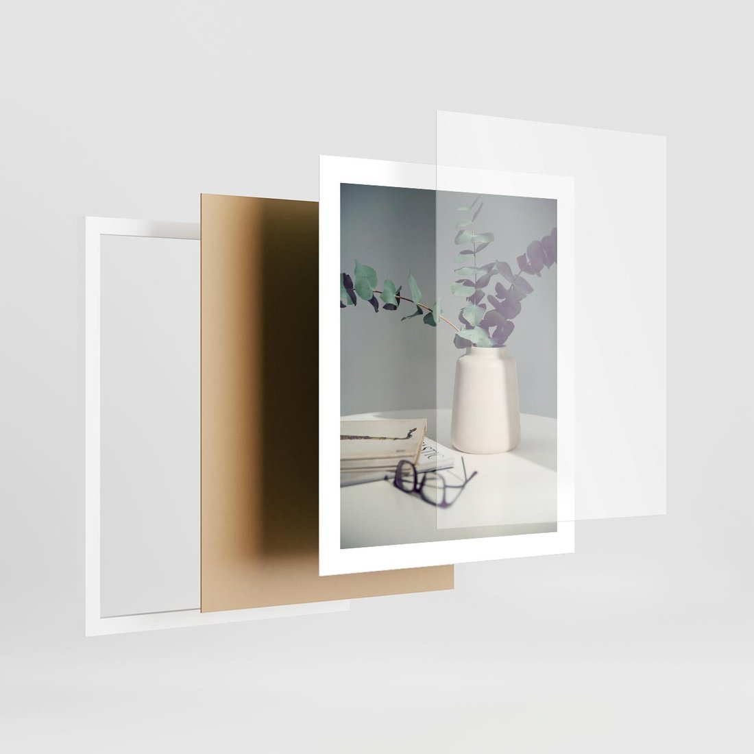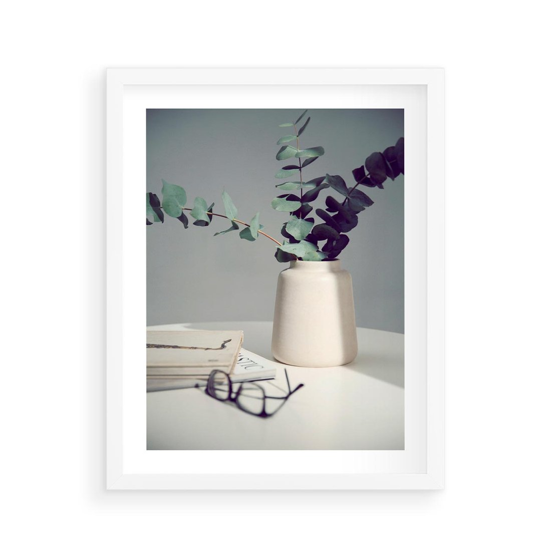 Obraz przedstawia kompozycję z liści eukaliptusa w wazonie, gazetą i okularami. Ta aranżacja oddaje atmosferę relaksu i czytania w spokojnym otoczeniu, doskonale pasując do wnętrz, które pragną wyrazić harmonię i spokój.