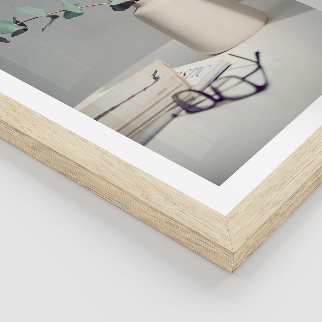 Obraz przedstawia kompozycję z liści eukaliptusa w wazonie, gazetą i okularami. Ta aranżacja oddaje atmosferę relaksu i czytania w spokojnym otoczeniu, doskonale pasując do wnętrz, które pragną wyrazić harmonię i spokój.
