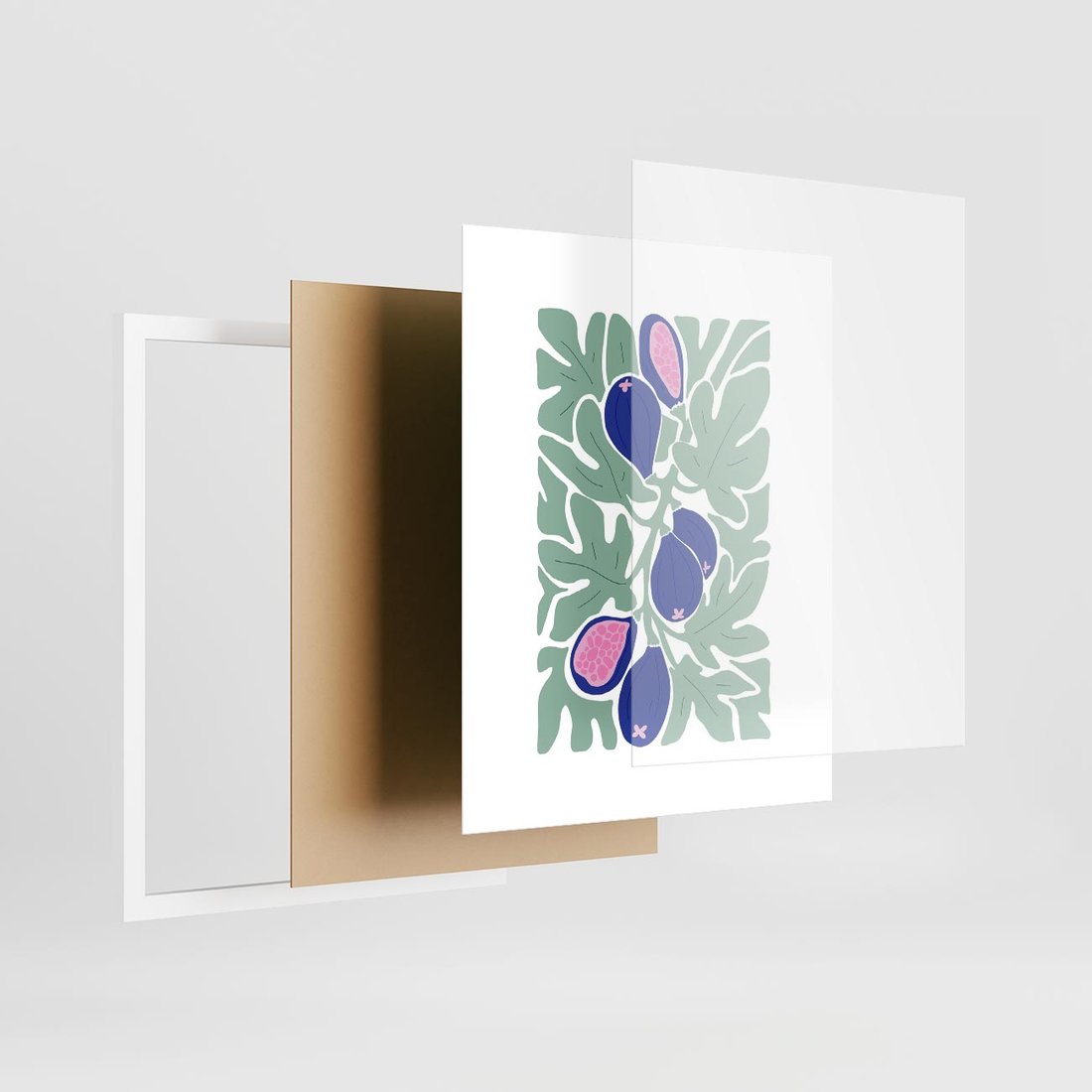 Odkryj minimalistyczną elegancję w tej abstrakcyjnej sztuce. Zestawienie fig w odcieniach fioletu i zieleni tworzy spokojną i inspirującą kompozycję, idealną do wnętrz o wyrafinowanym stylu.