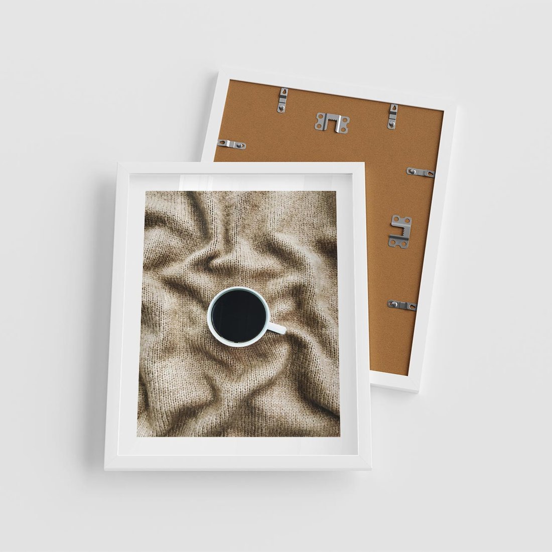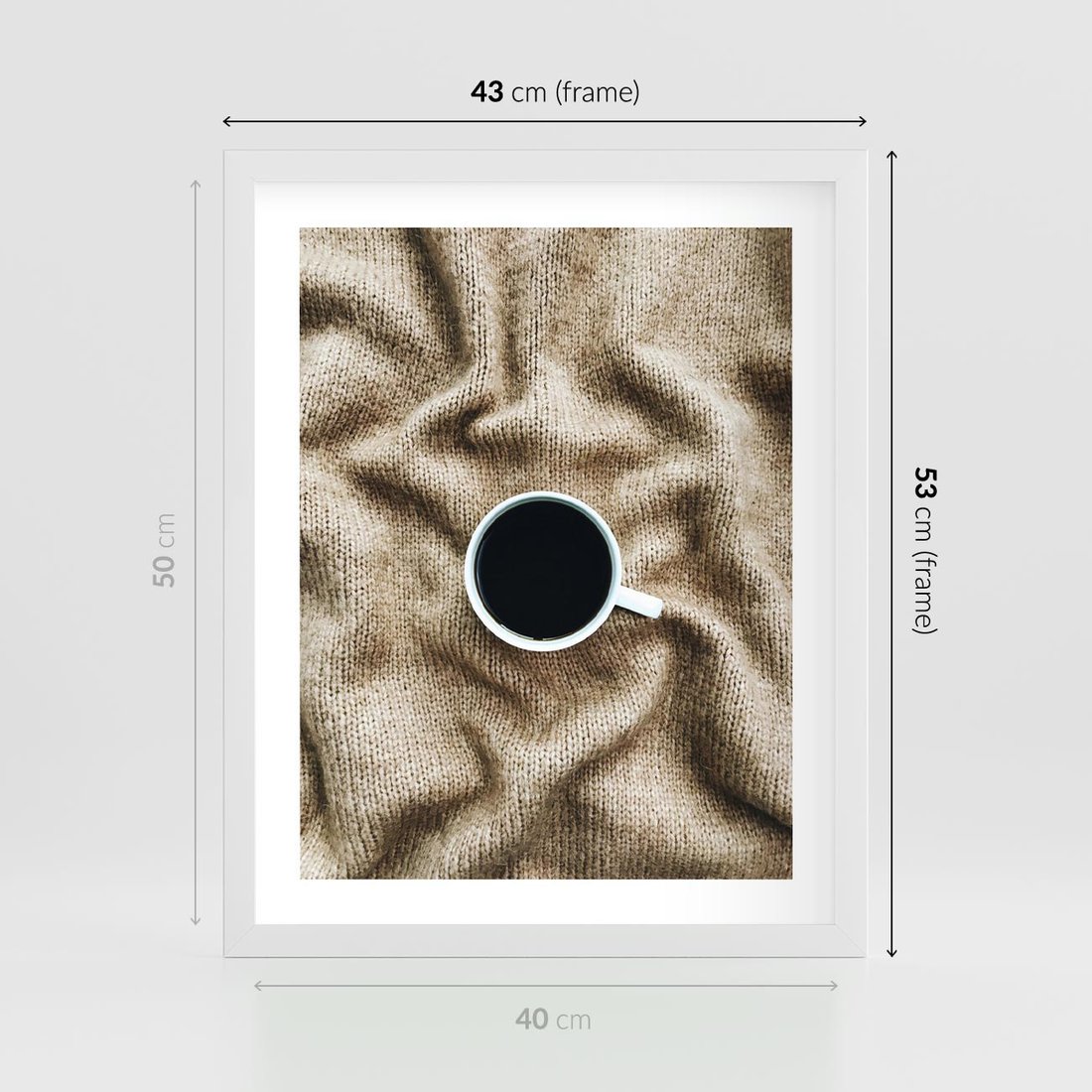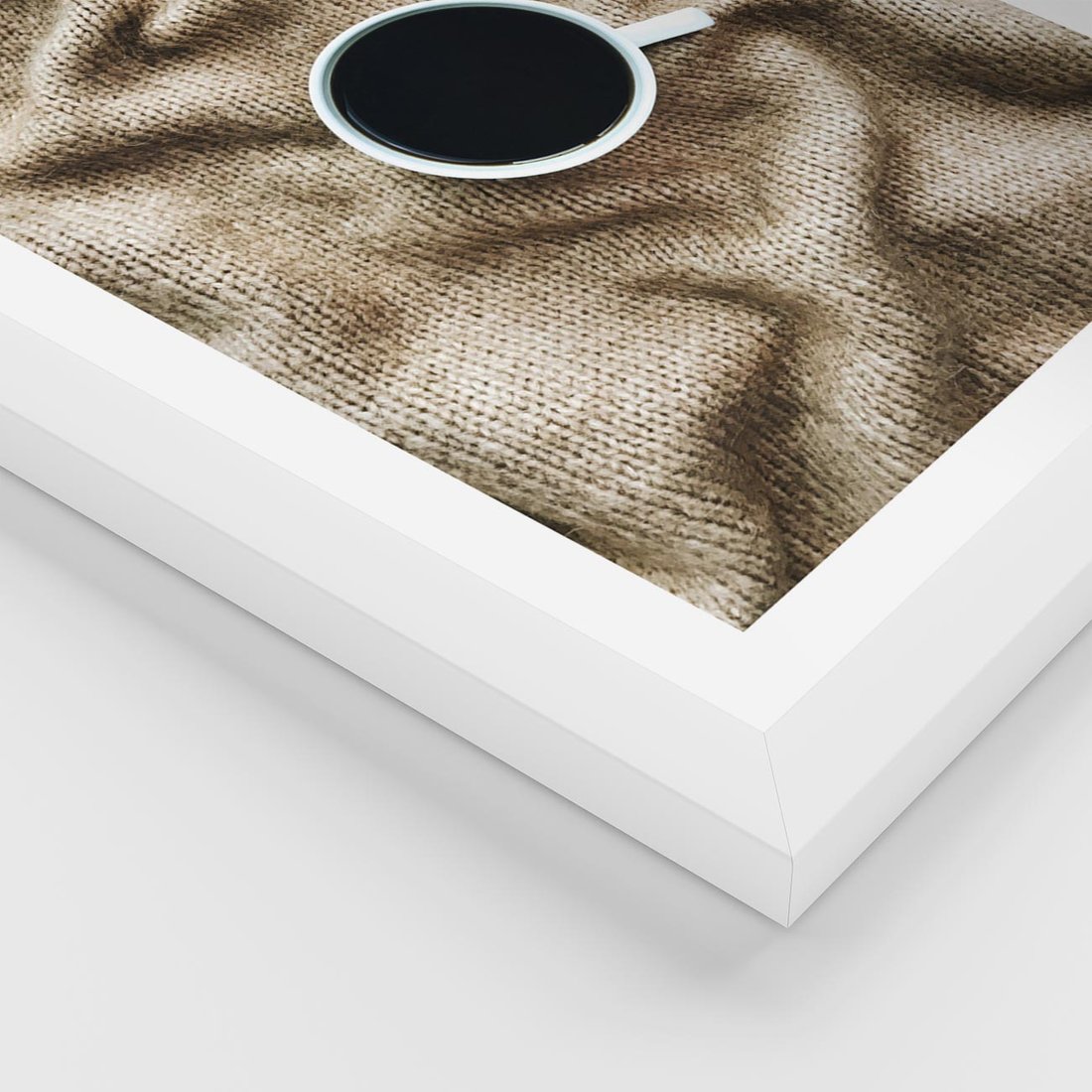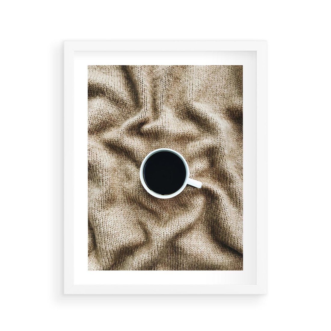 Plakat w ramie 40x50 - Filiżanka Kawy na Brązowym Kocu - kawa, czarna kawa - rama biała