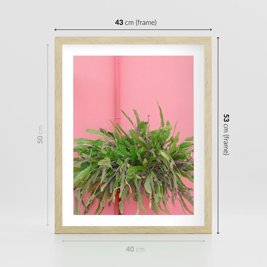 Plakat w ramie 40x50 - Fotografia Rośliny z Różowym Tłem - fotografia, zielona roślina na tle różwj ściany - rama drewno