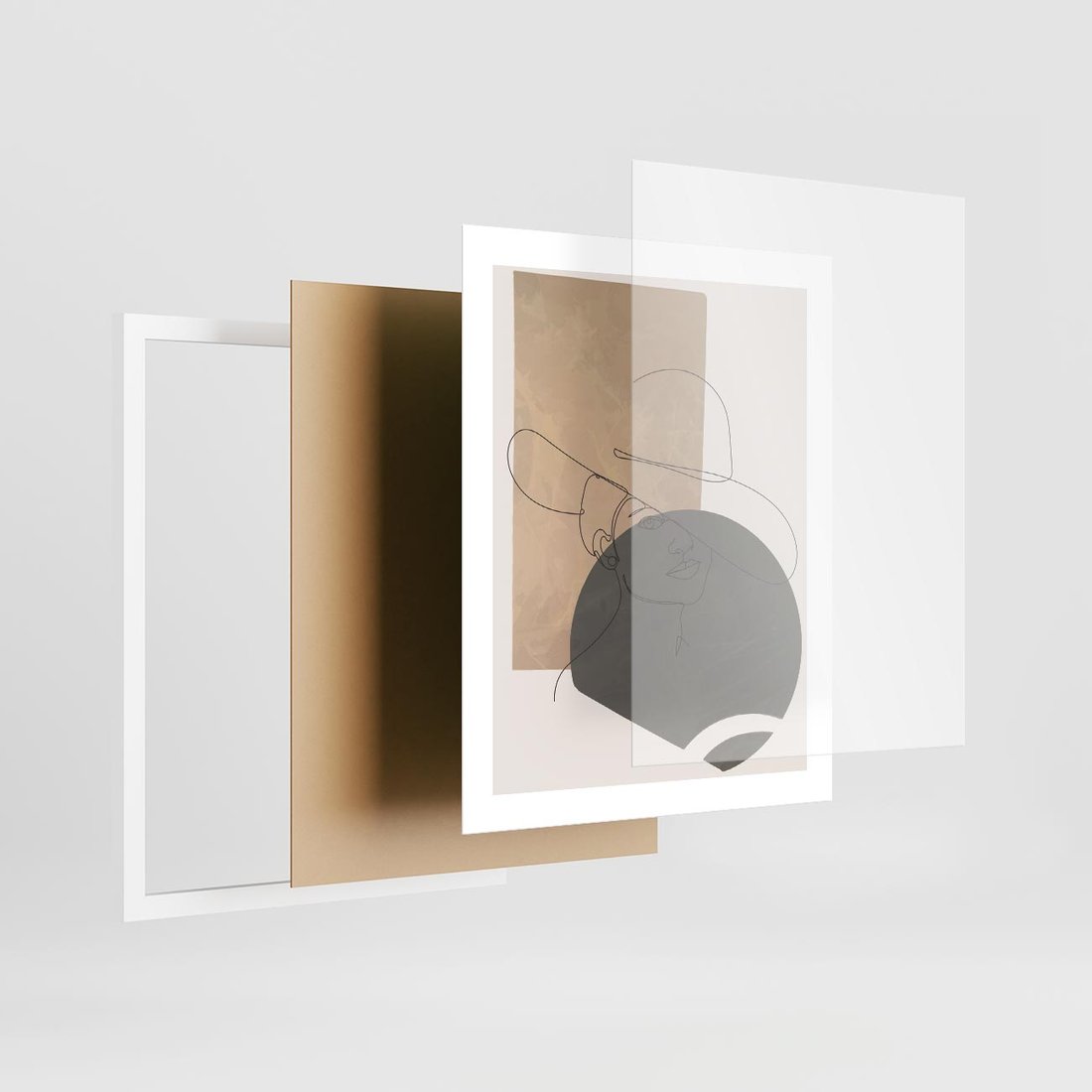 Obraz przedstawia nowoczesną sztukę o motywach geometrycznych, w tonacji bezowych kolorów. Centralnym elementem jest szkic kobiety wykonany jednym ciągłym, dynamicznym ruchem (one line), co nadaje dziełu wyjątkową oryginalność. Idealnie pasuje do minimalistycznych wnętrz o subtelnym designie.