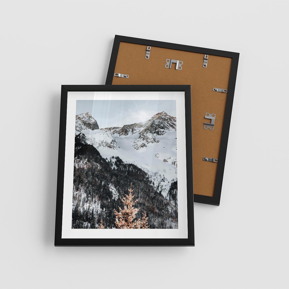 To malowniczy pejzaż górski, gdzie masywne góry pokryte są białym śniegiem, tworząc urokliwy i majestatyczny krajobraz. Obraz doskonale pasuje do wnętrz o charakterze przyrodniczym, rustykalnym lub skandynawskim, nadając im spokój i inspirację naturą.