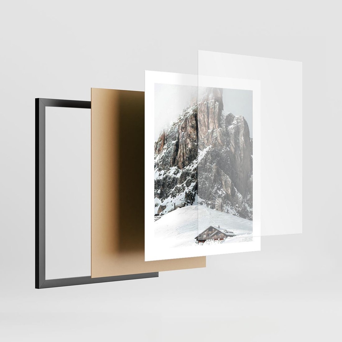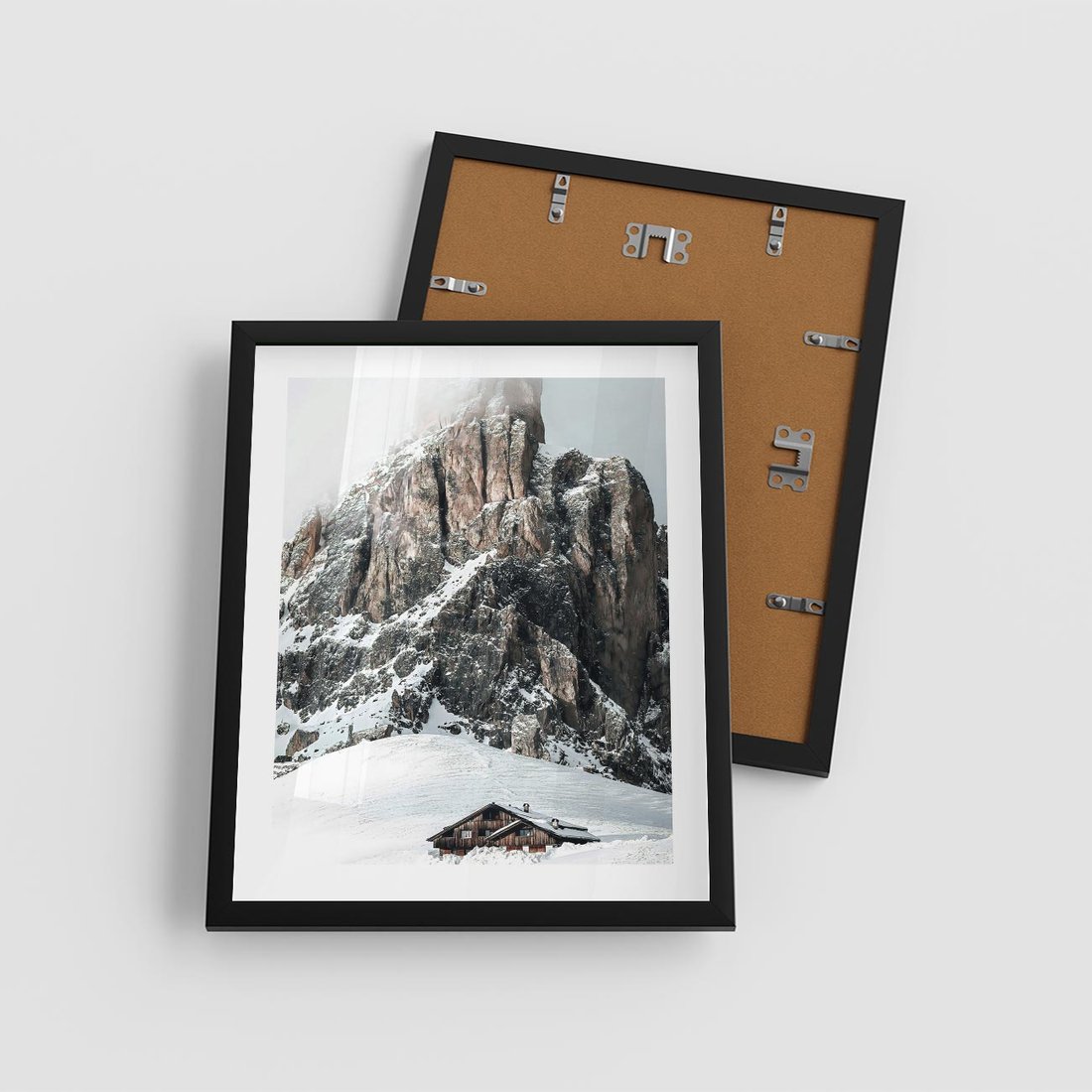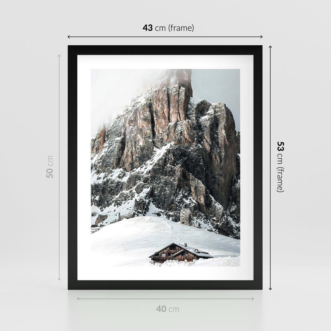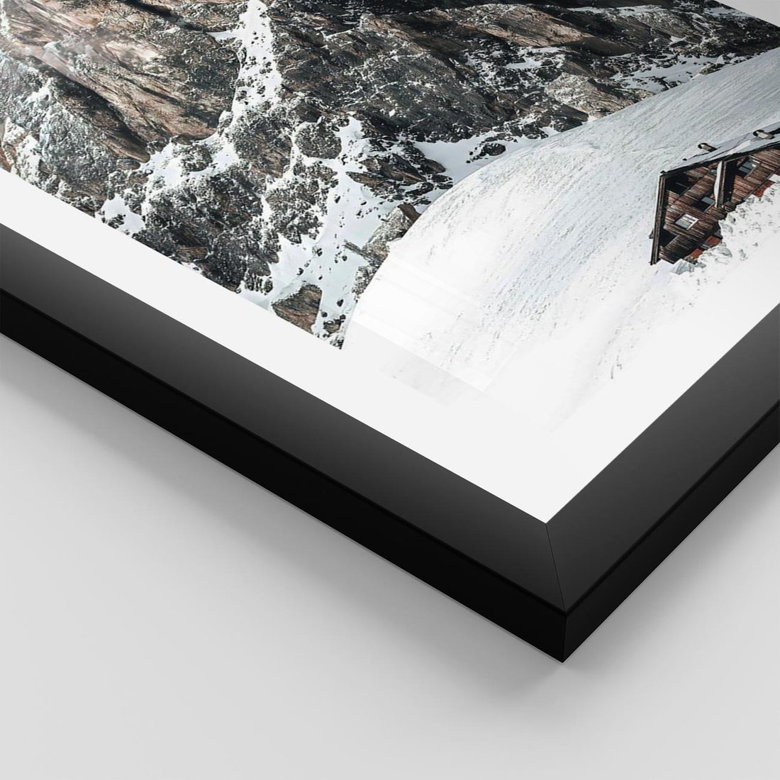 Plakat w ramie 40x50 - Górski Raj z Chatką - górskie szczyty, ośnieżone góry - rama czarna