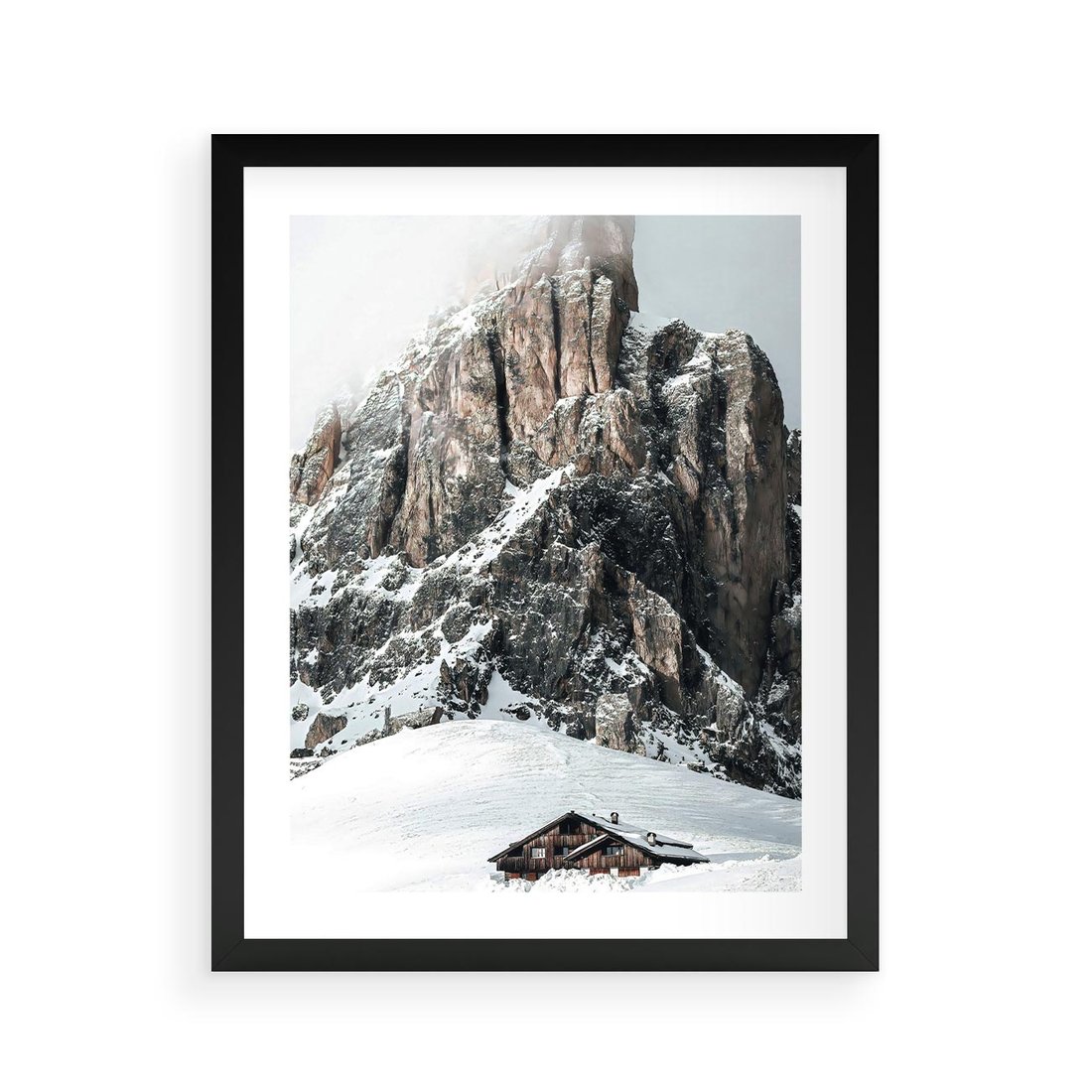 Obraz przedstawia majestatyczne górskie szczyty pokryte śniegiem, a wśród nich uroczą chatkę w górach. Ta sceneria doskonale pasuje do wnętrz utrzymanych w stylu górskim lub chalet, dodając im atmosferycznego uroku.