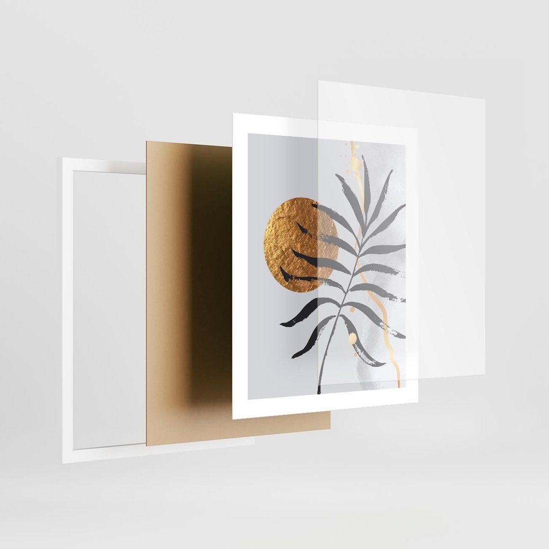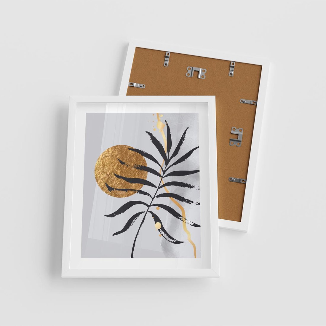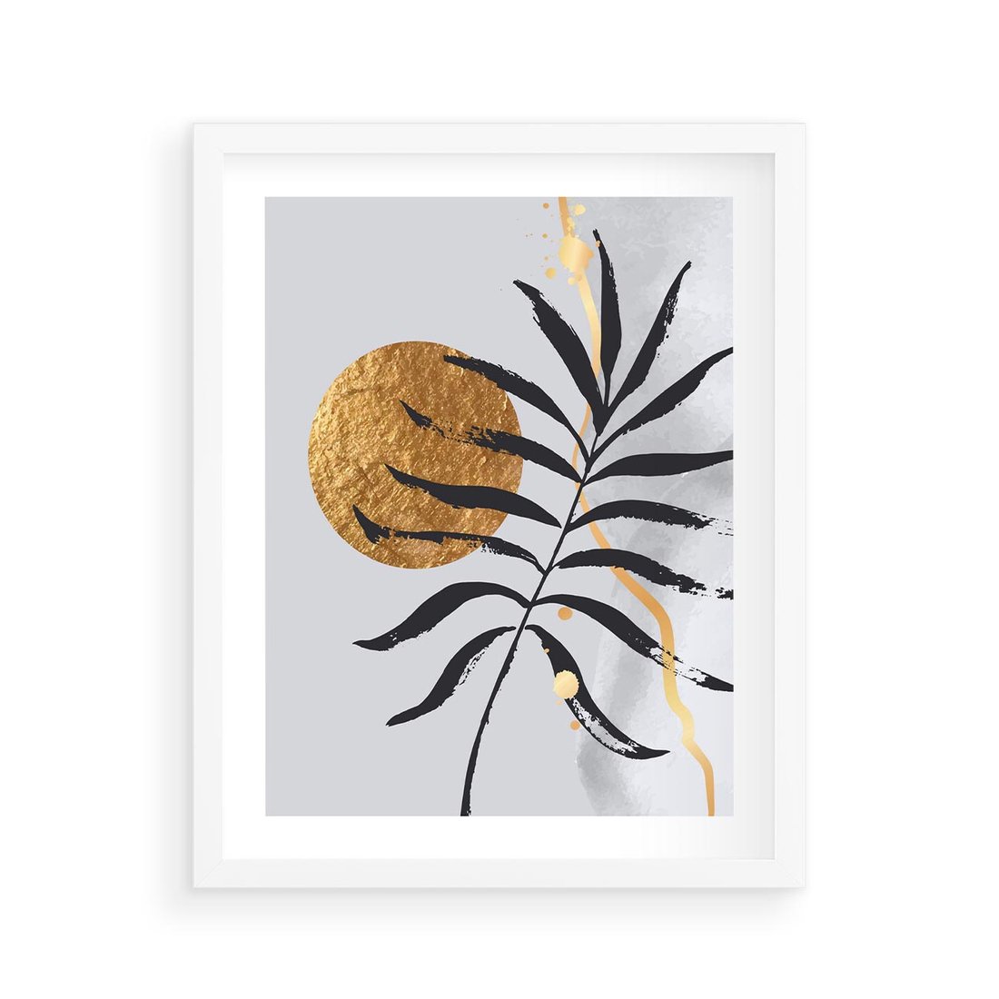 Plakat w ramie 40x50 - Grafika z Czarnym Liściem Palmy - czarny liść palmy, złóte kołó - rama biała