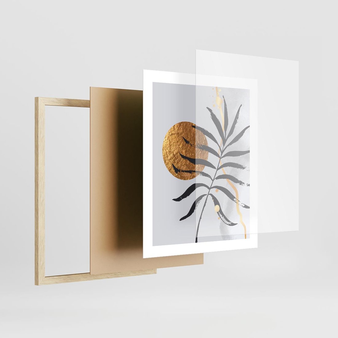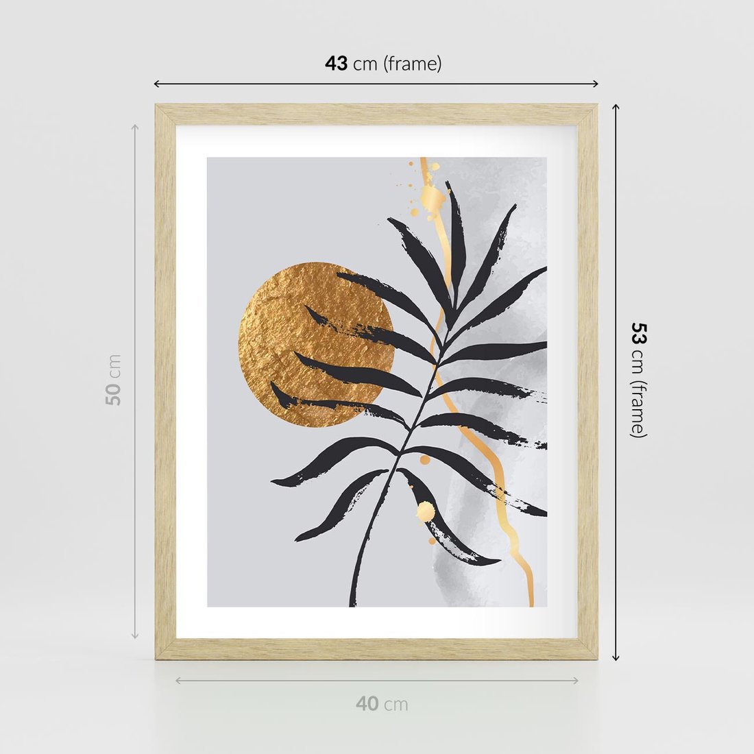 Plakat w ramie 40x50 - Grafika z Czarnym Liściem Palmy - czarny liść palmy, złóte kołó - rama drewno