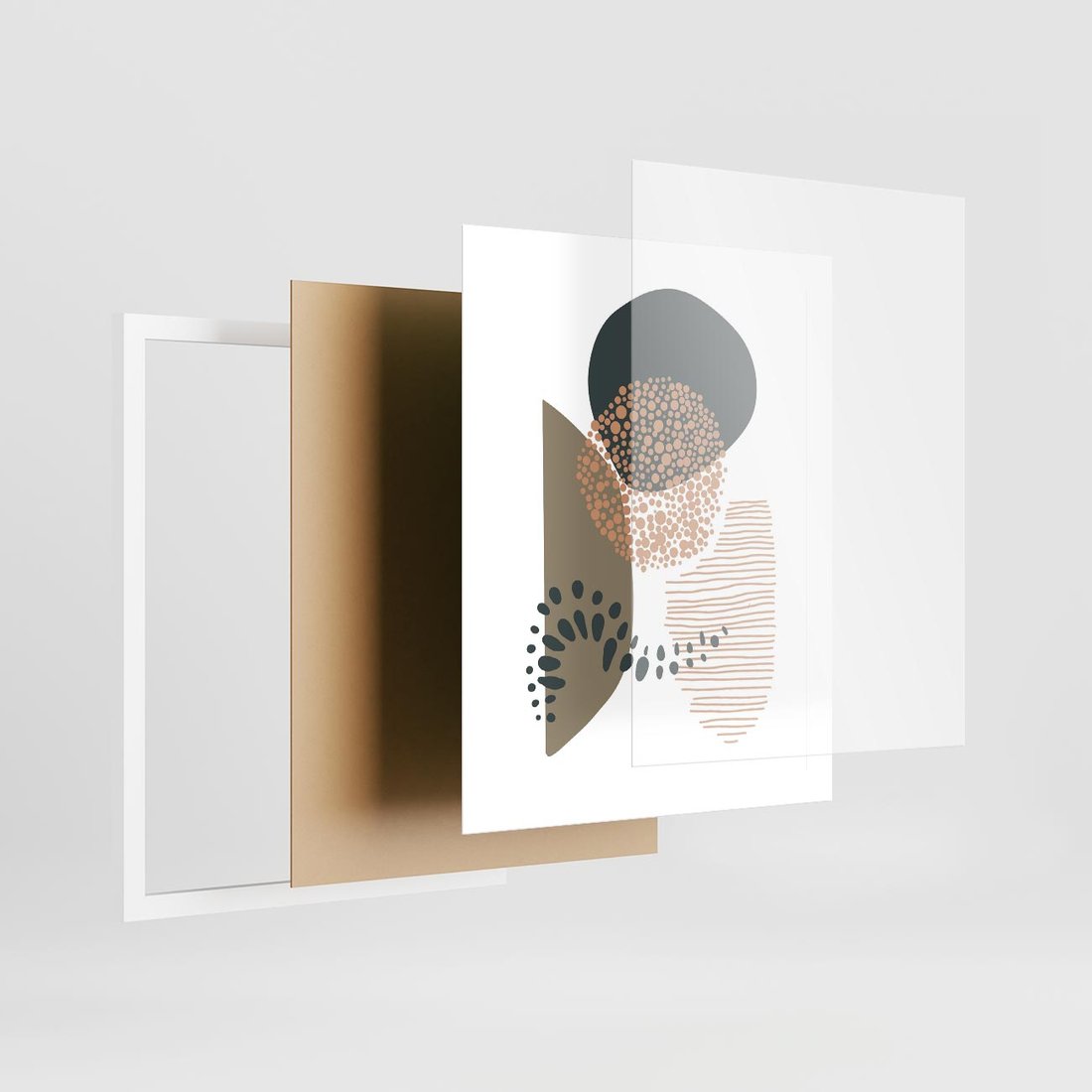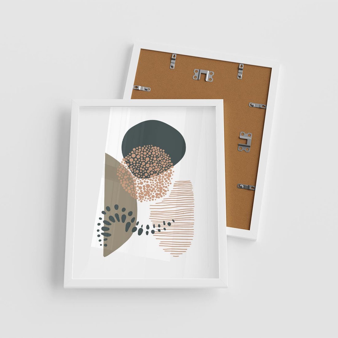 Ta abstrakcyjna kompozycja składa się z delikatnych kropek, kresek i kółek, w stonowanych odcieniach brązu i beżu. Przenosi spokój i harmonię, emanując minimalistycznym pięknem do każdego wnętrza.