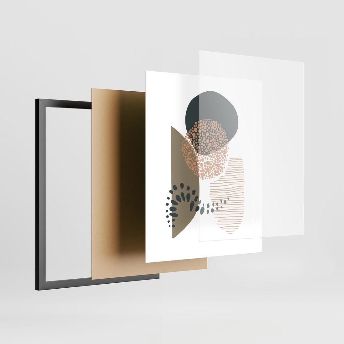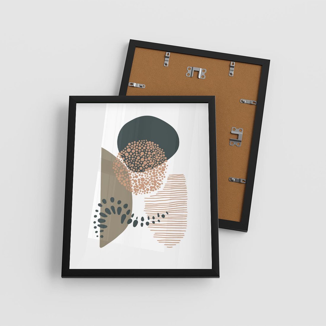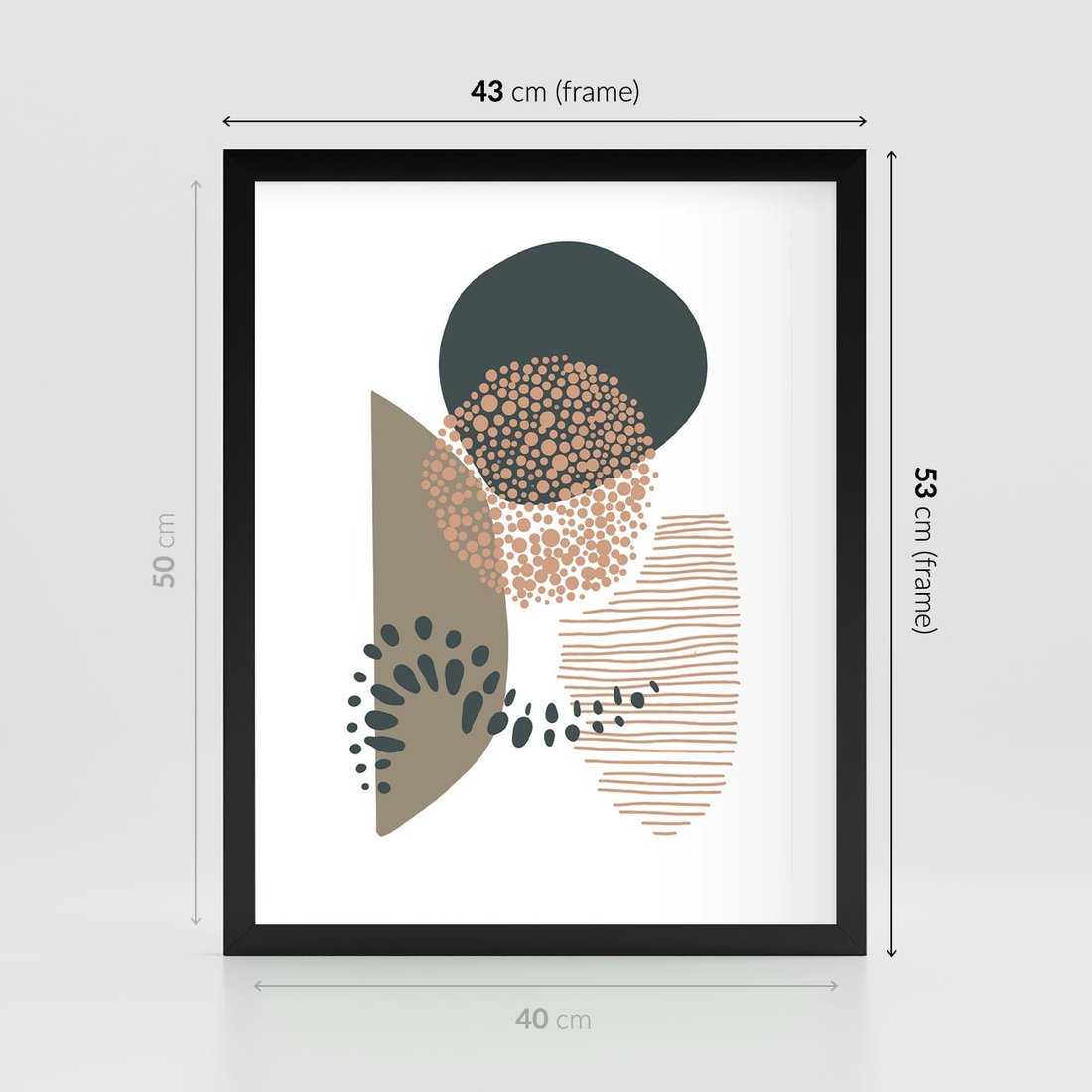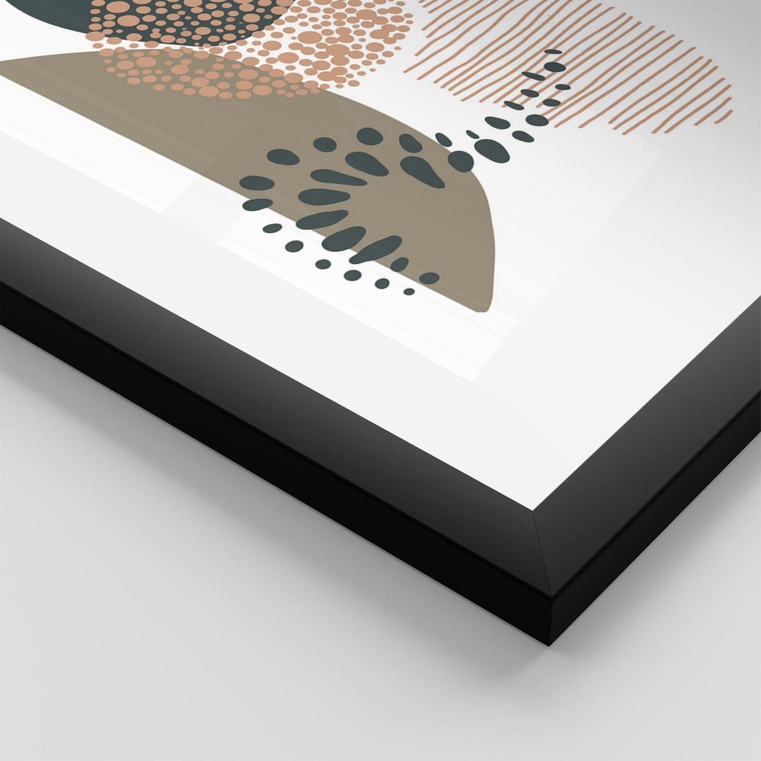 Plakat w ramie 40x50 - Harmonia Akwarelowych Przestrzeni - abstrakcyjna kompozycja z kropek kresek i kółek, odcienie brązu i beżu - rama czarna