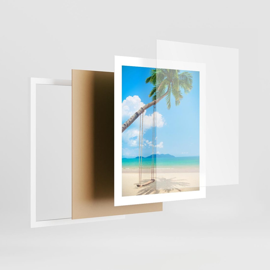 Plakat w ramie 40x50 - Hawajska palma i huśtawka na plaży - palma, huśtawka - rama biała