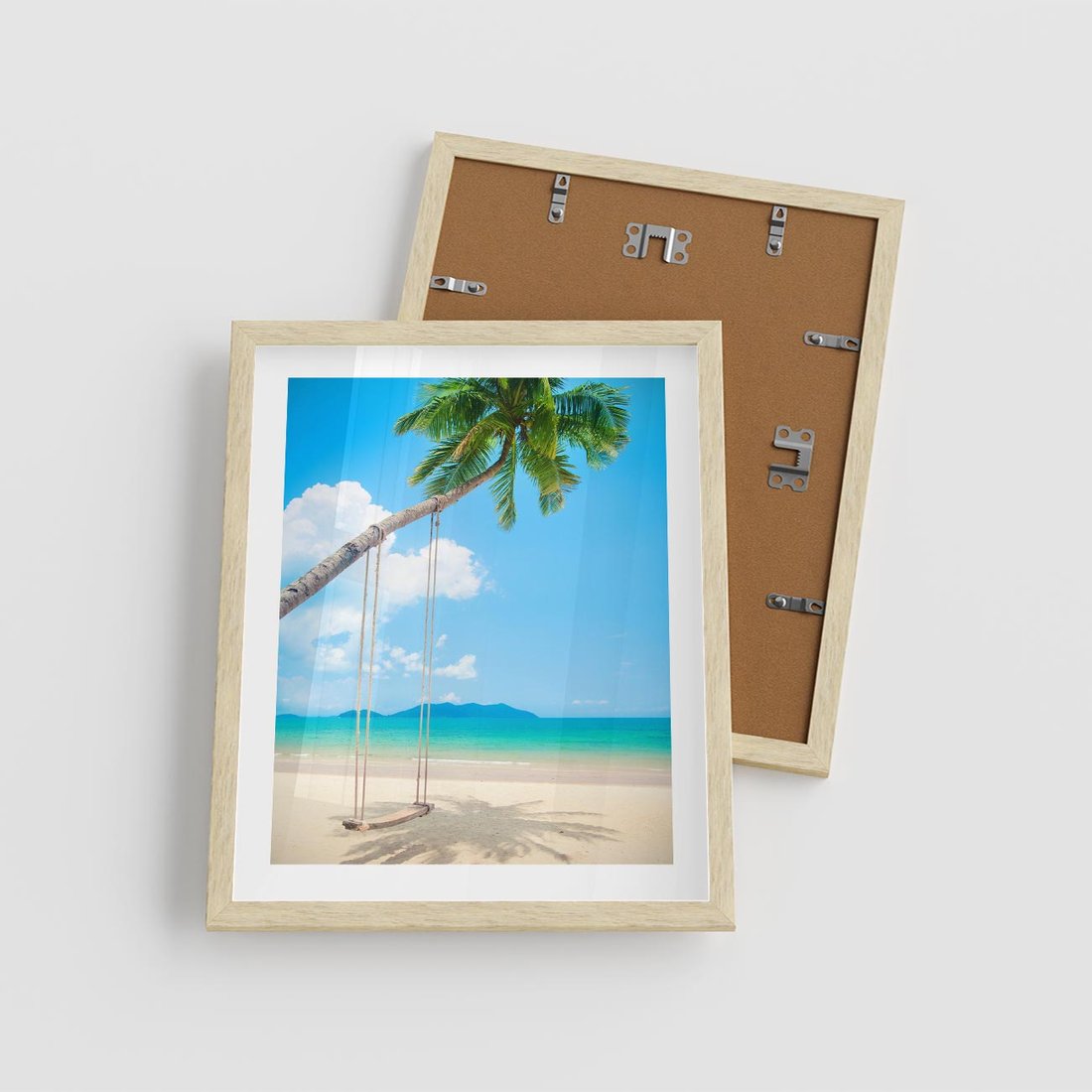 Plakat w ramie 40x50 - Hawajska palma i huśtawka na plaży - palma, huśtawka - rama drewno