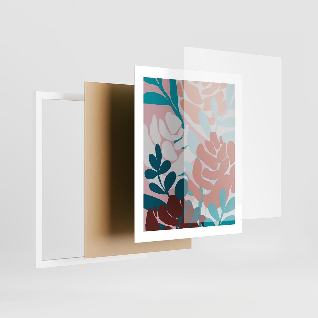Abstrakcyjna kompozycja kwiatowych form ukazuje delikatne piękno natury w nowoczesny sposób. Zgaszone kolory dodają subtelności i tajemniczości, tworząc harmonijną i elegancką sztukę, która zachwyca swoją unikalną interpretacją.