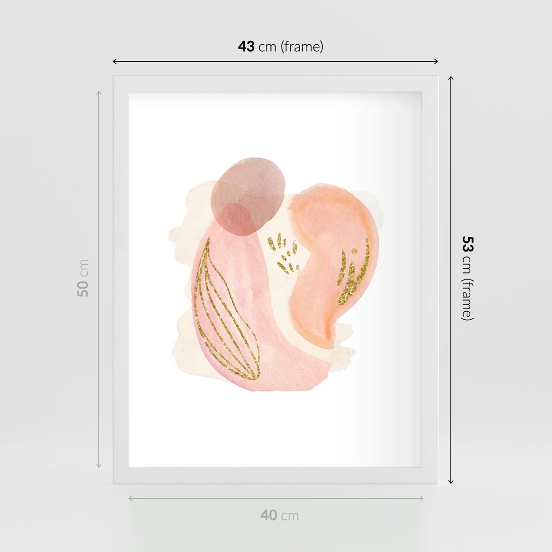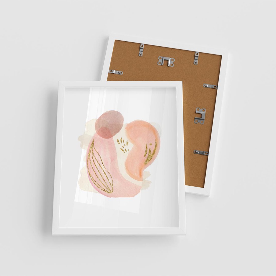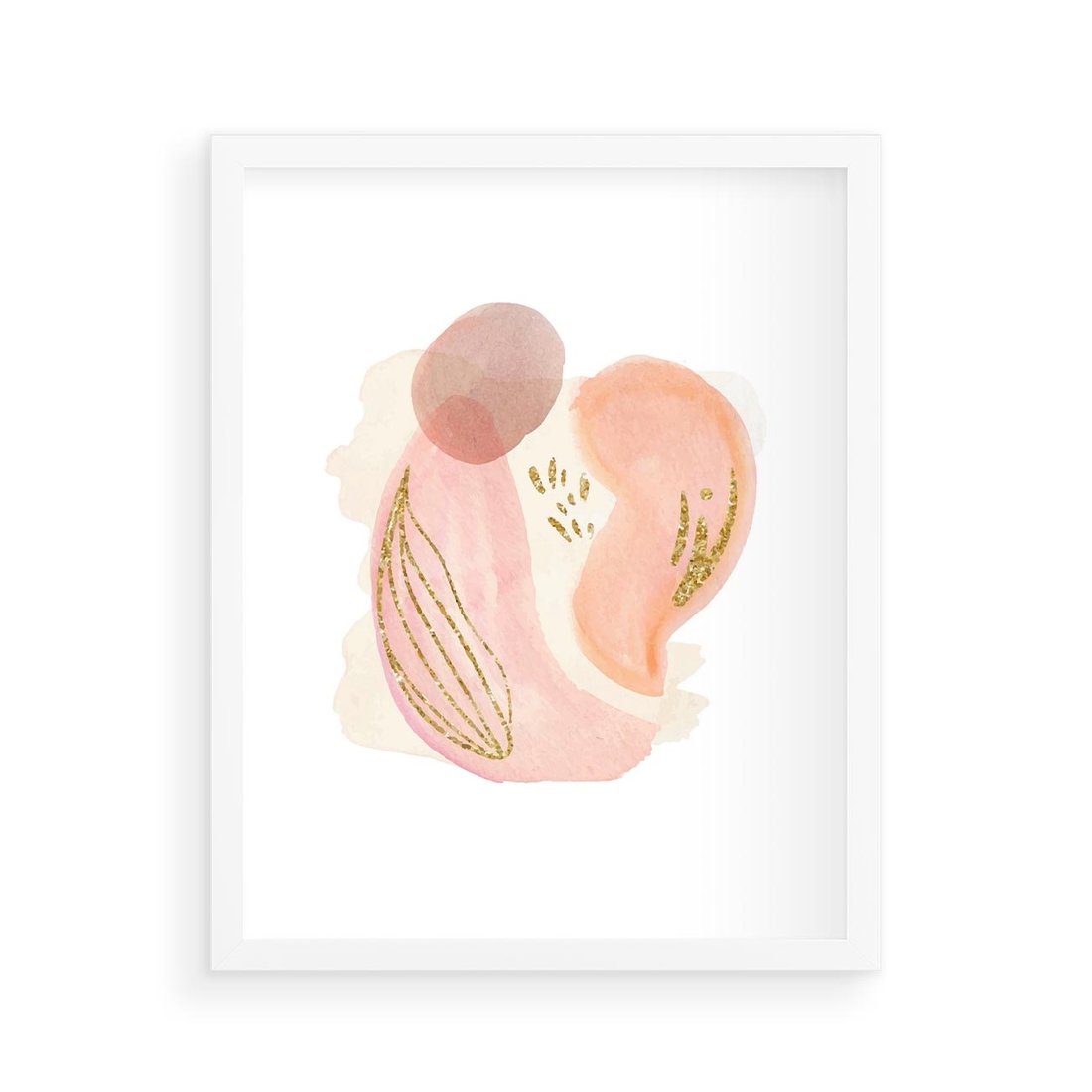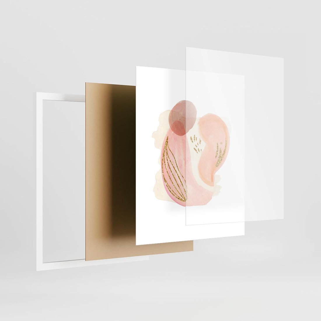Abstrakcyjne akwarelowe plamy w minimalistycznym stylu. Subtelne pastele złagodzone złotymi elementami tworzą spokojną i wyrafinowaną kompozycję.