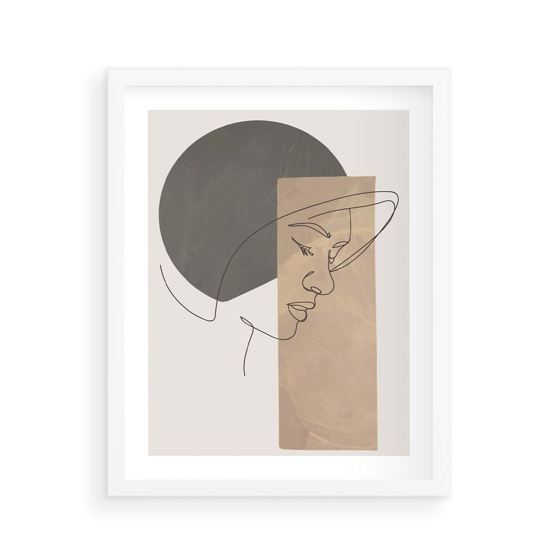Plakat w ramie 40x50 - Jedną Linią: Kobieca Twarz - abstrakcja, plamy w tle - rama biała