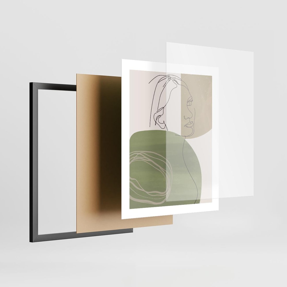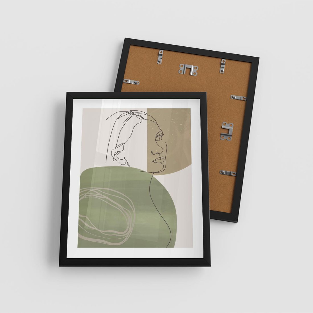 Plakat w ramie 40x50 - Jedna Linia, Wiele Emocji - akwarelowe plamy, na nich szkic postaci kobiety jedną linią - rama czarna