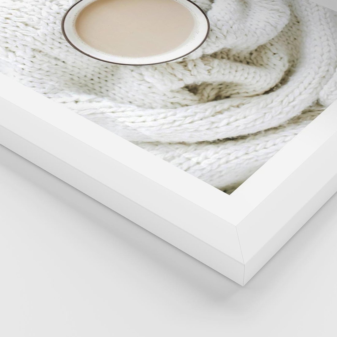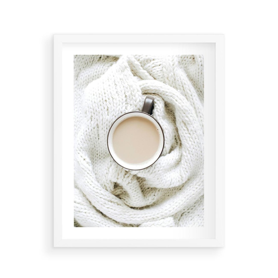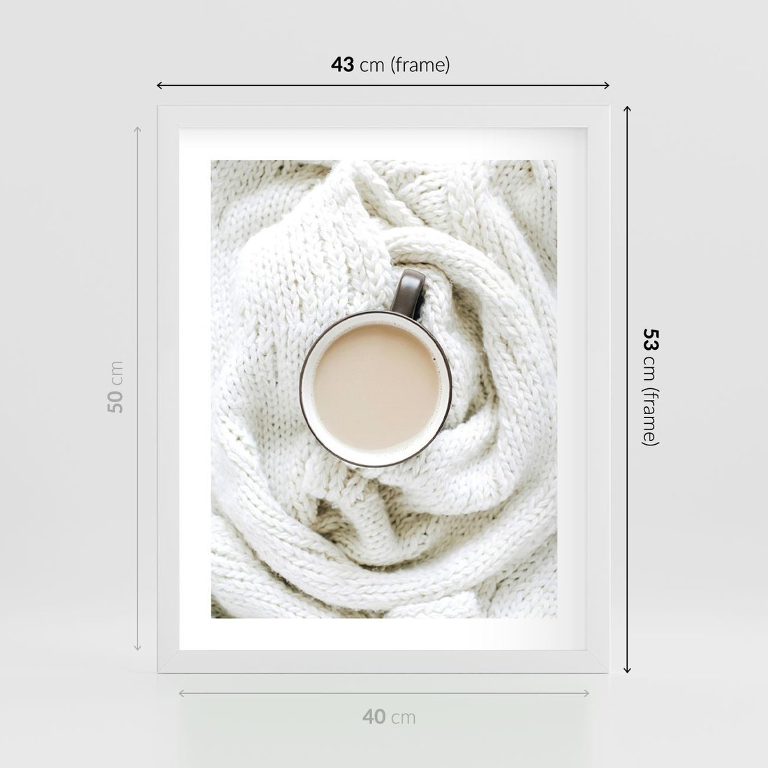 Plakat w ramie 40x50 - Kawa na Wełnianym Kocu - kawa, biały wełniany koc - rama biała