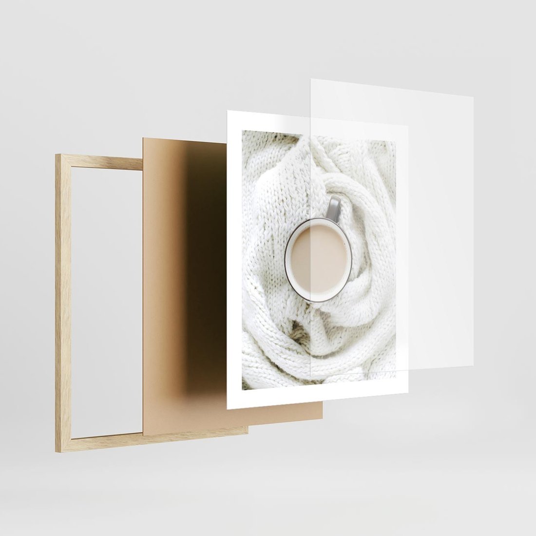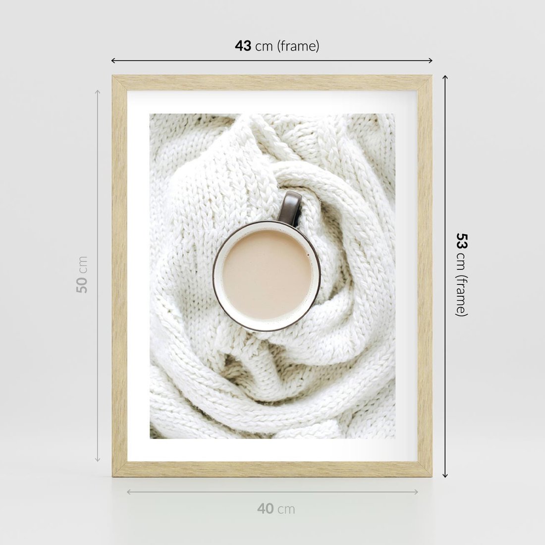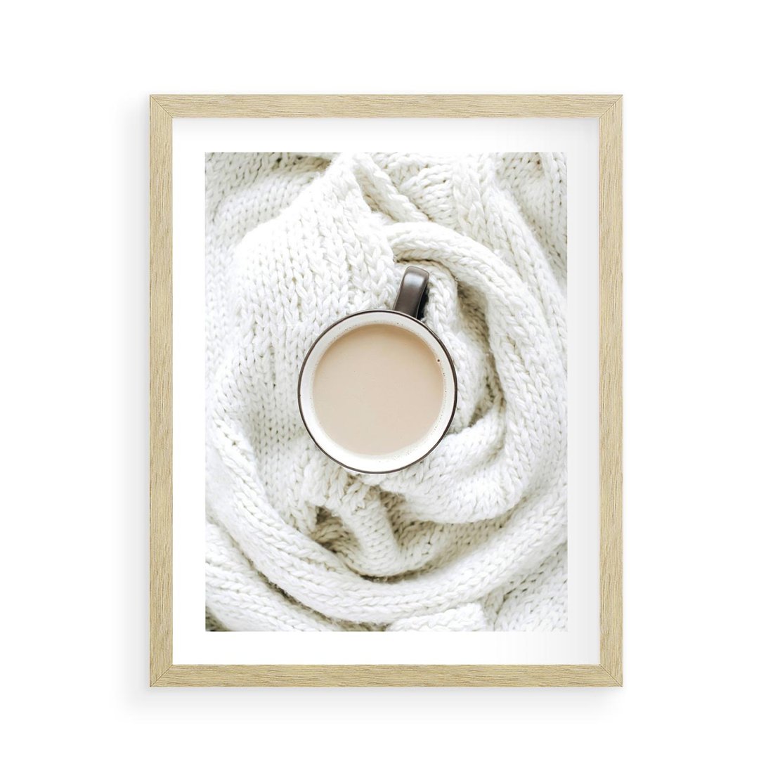 Plakat w ramie 40x50 - Kawa na Wełnianym Kocu - kawa, biały wełniany koc - rama drewno