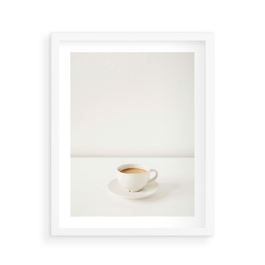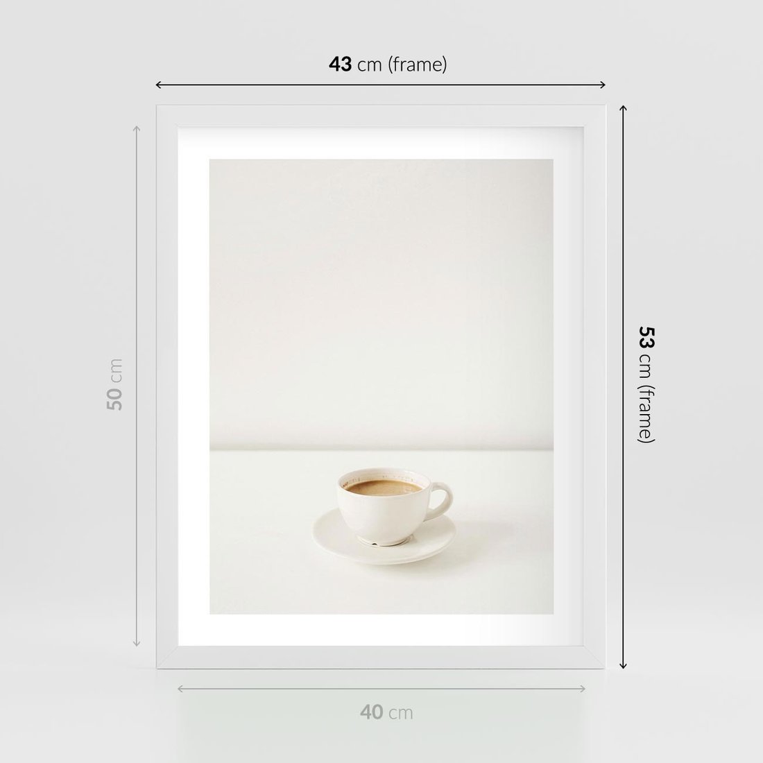 Plakat w ramie 40x50 - Kawa w Prostocie - kawa w filizance, białe tłó - rama biała