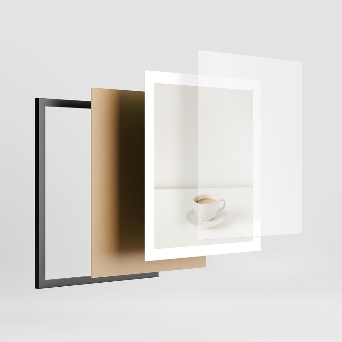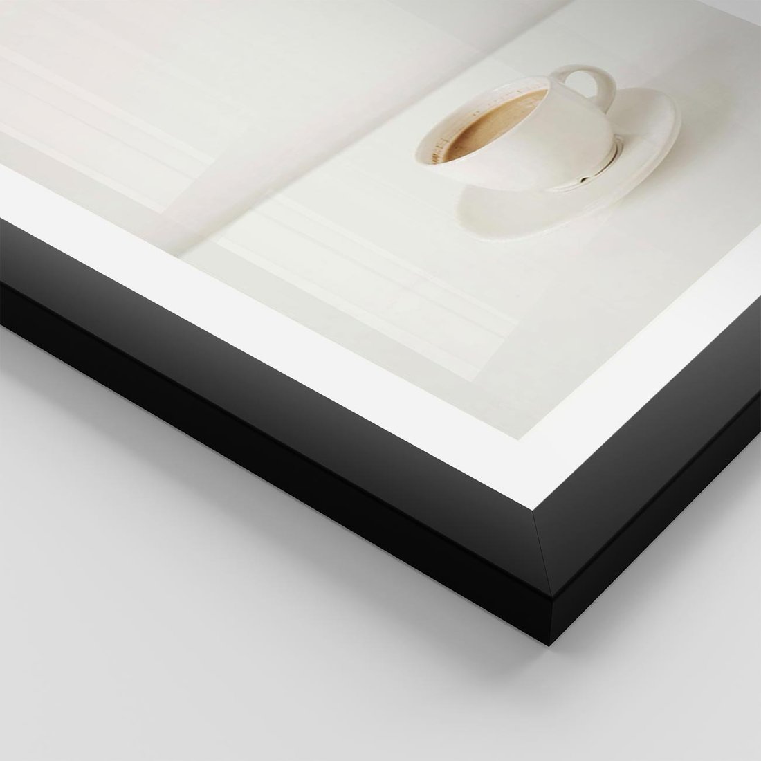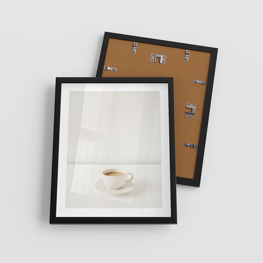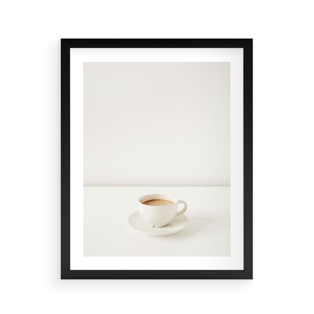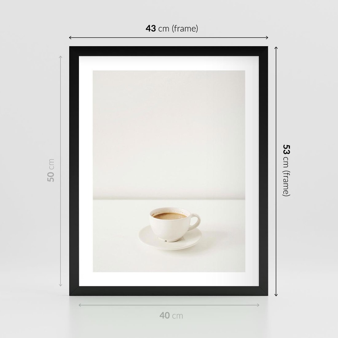 Plakat w ramie 40x50 - Kawa w Prostocie - kawa w filizance, białe tłó - rama czarna