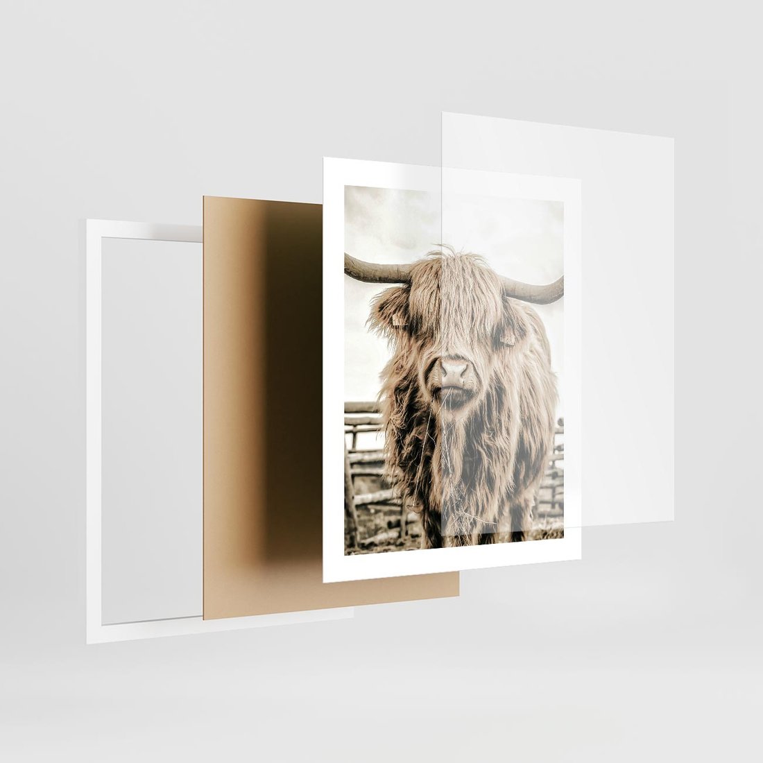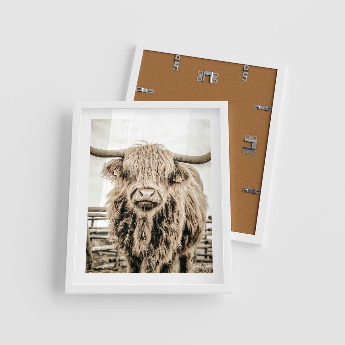 Plakat w ramie 40x50 - Klimat Wiejskiego Życia - amerykańska krowa, byk - rama biała