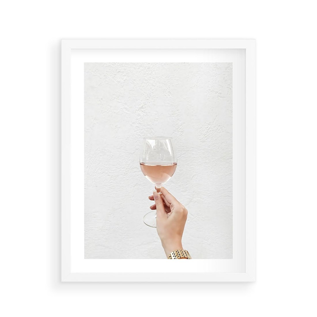 Plakat w ramie 40x50 - Kobieca Dłoń i Różowe Wino - kieliszek różowego wina, kobieca dłoń - rama biała