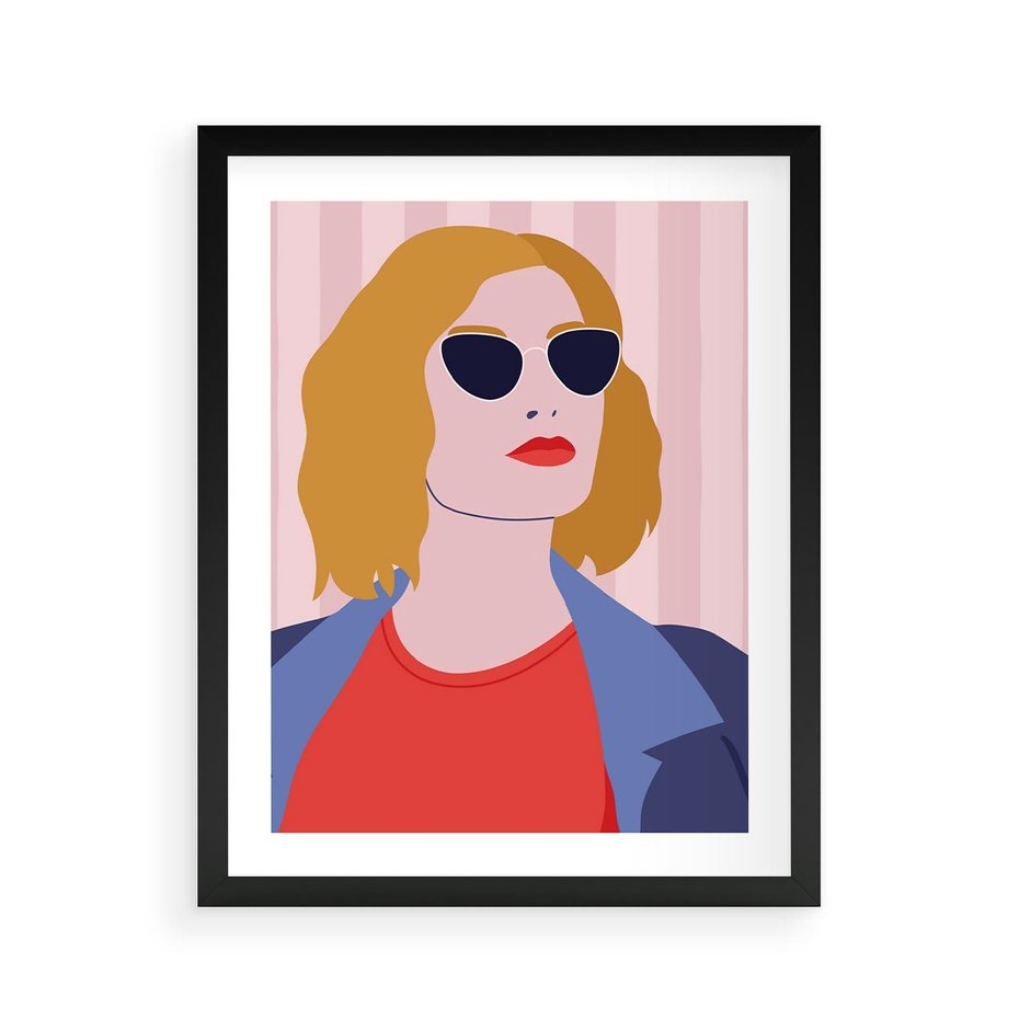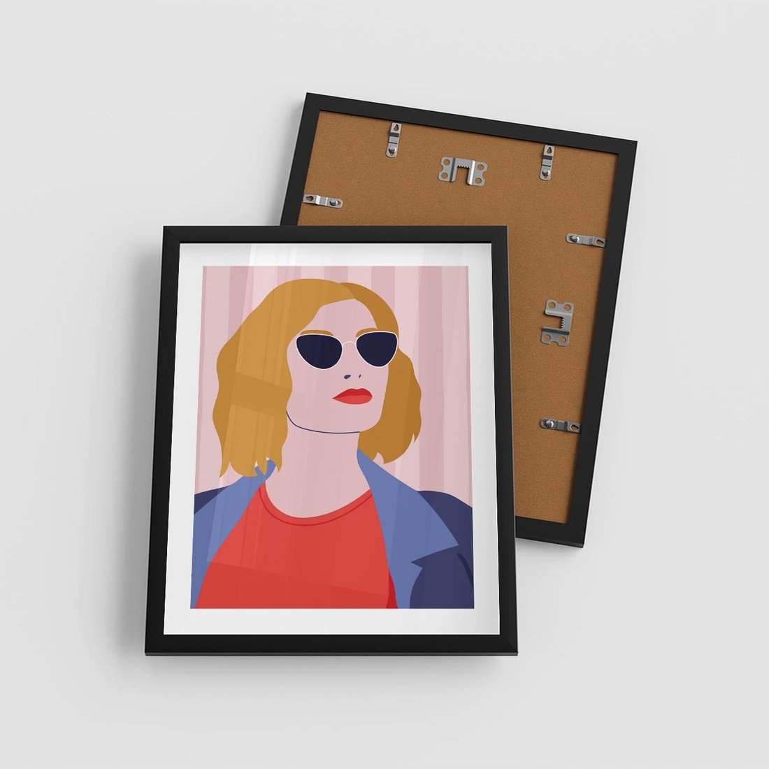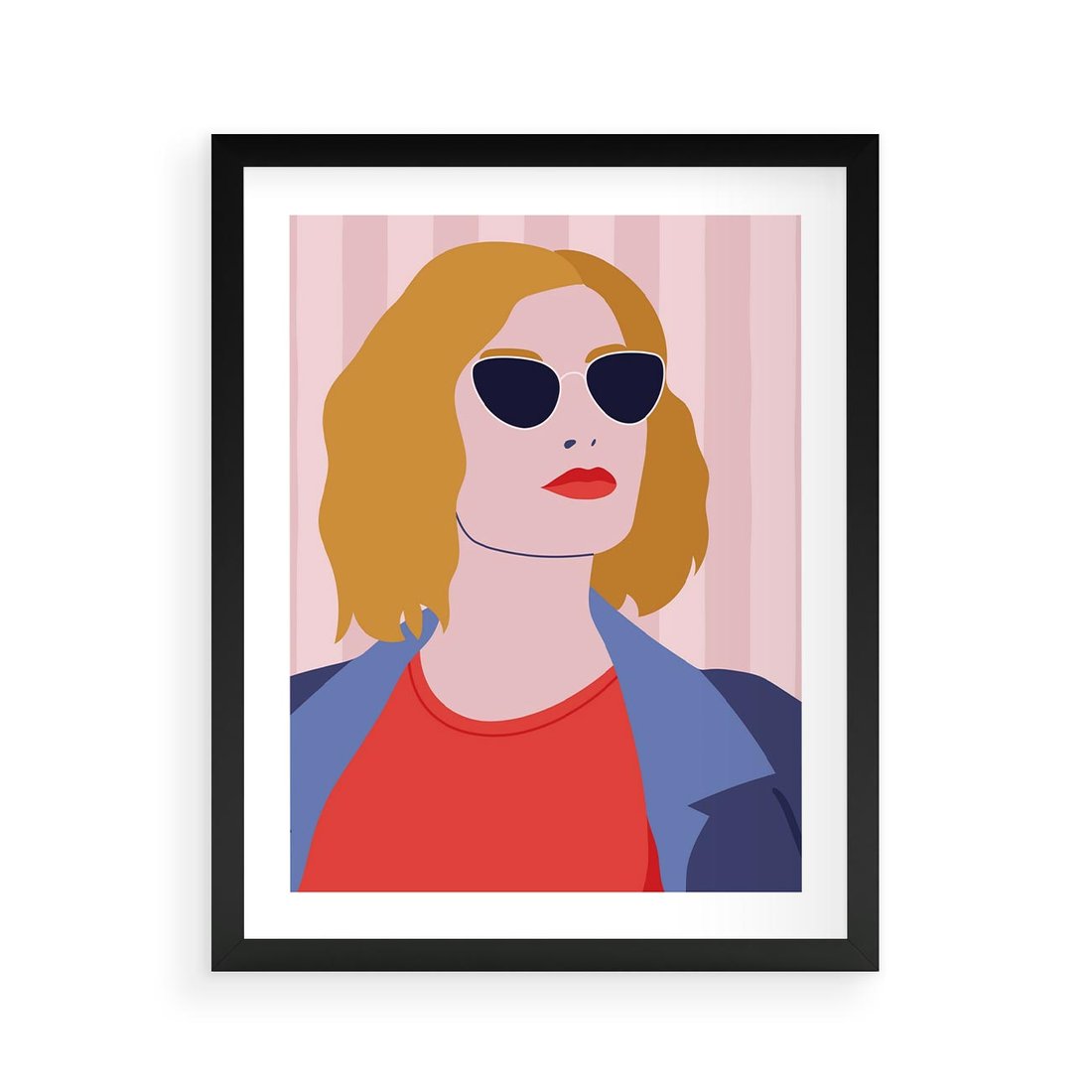 Nowoczesny plakat w stylu retro przedstawia kobieta w okularach słonecznych. Żywe kolory dodają energii i wyrazu, tworząc unikalną kompozycję z nutą nostalgii i współczesności.