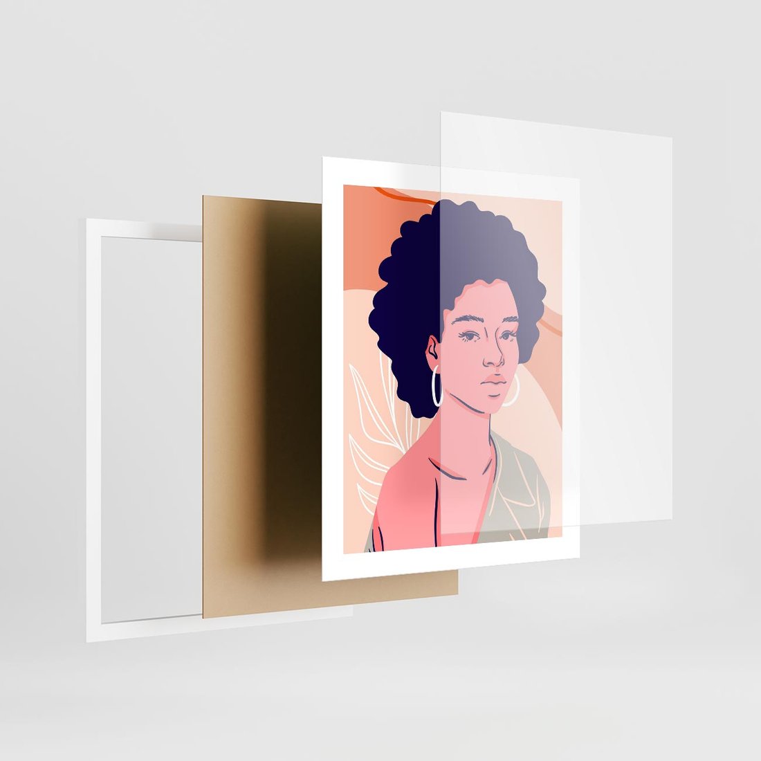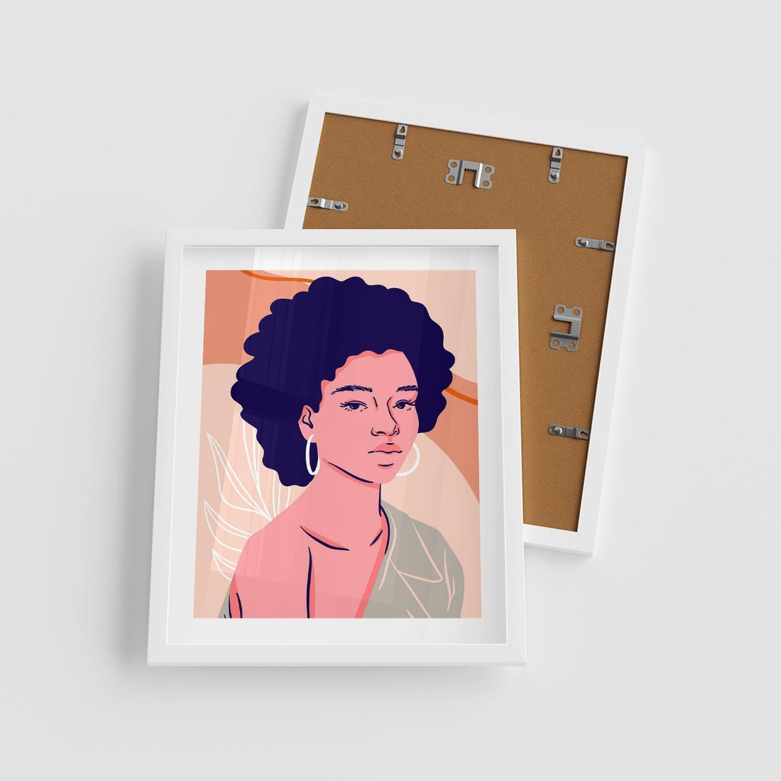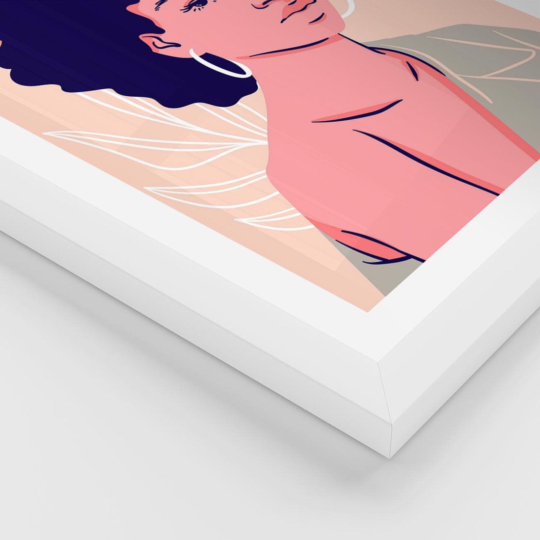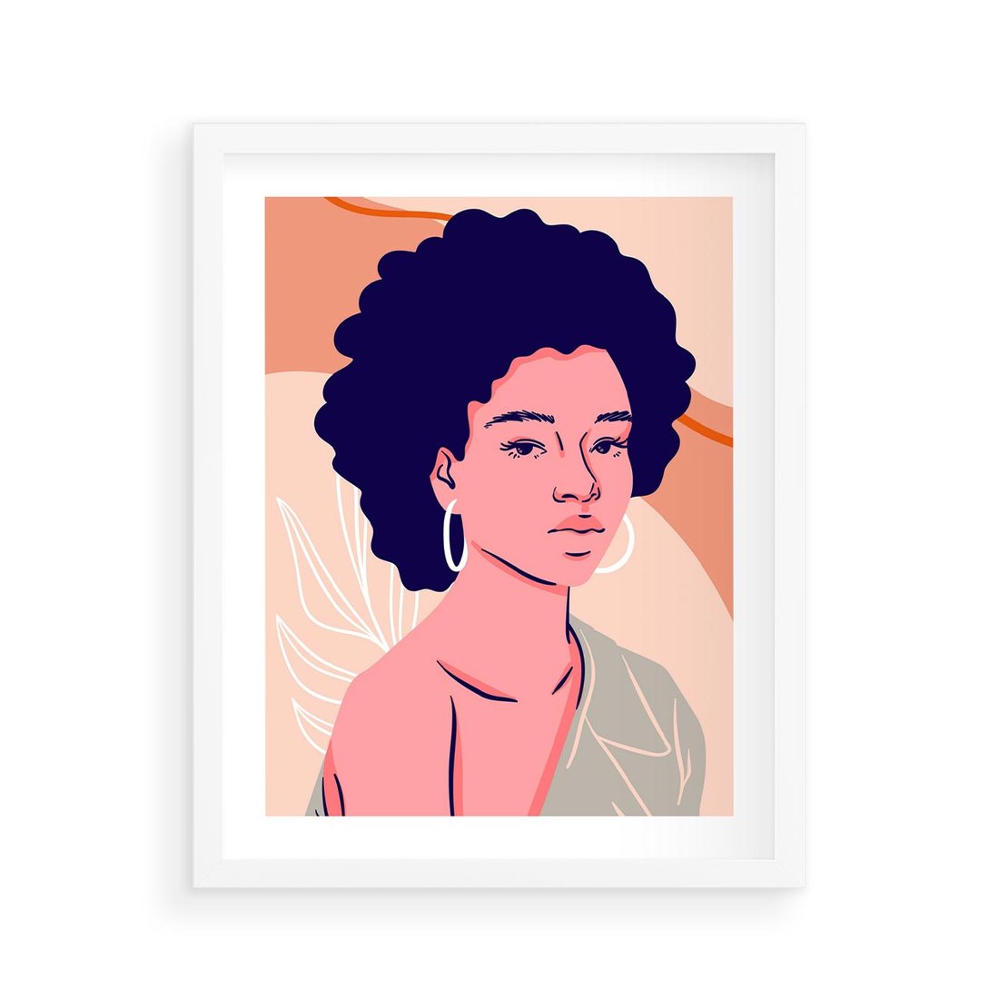 W stylowym plakacie o nowoczesnym wydźwięku retro widnieje portret kobiety w stonowanych kolorach. To połączenie klasycznego charakteru z nowoczesnością, tworzące wyrafinowaną i harmonijną kompozycję.