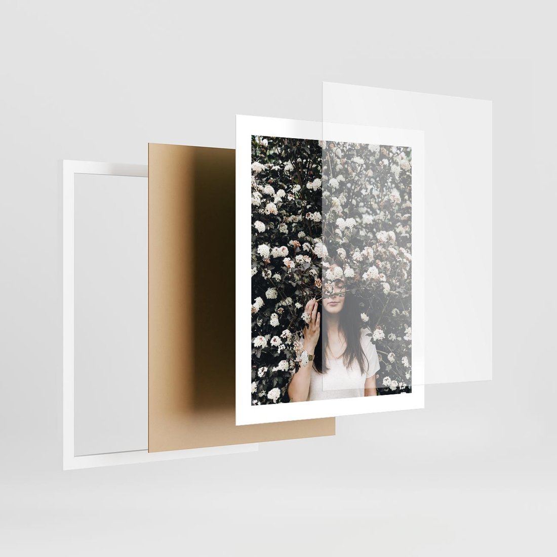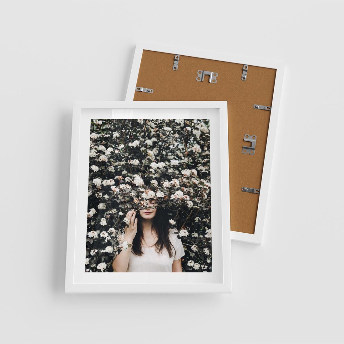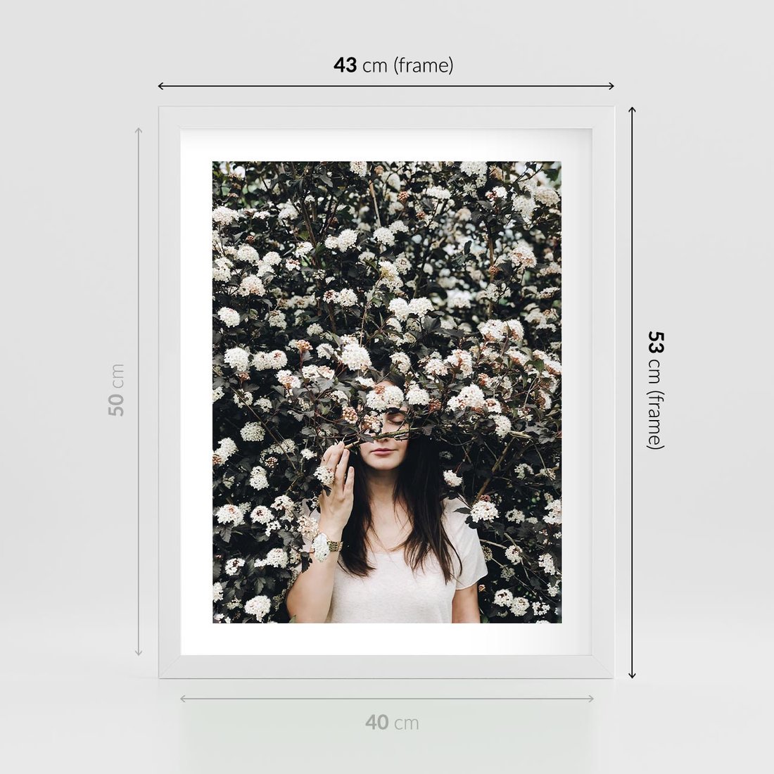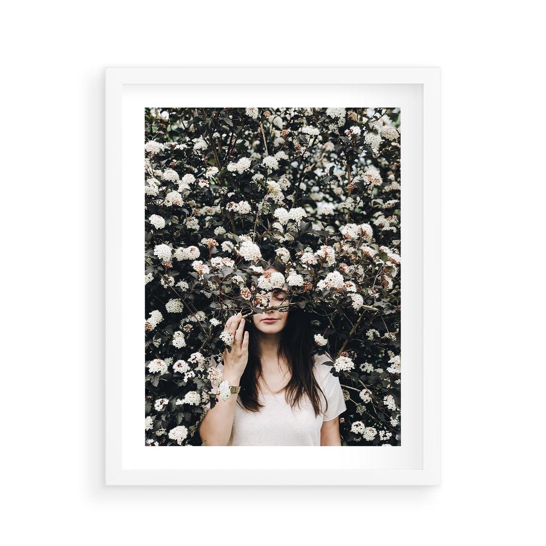 Plakat w ramie 40x50 - Kobieta w Krzewie Kwiatów - krzak z kwiatami, schowana za nim kobieta - rama biała