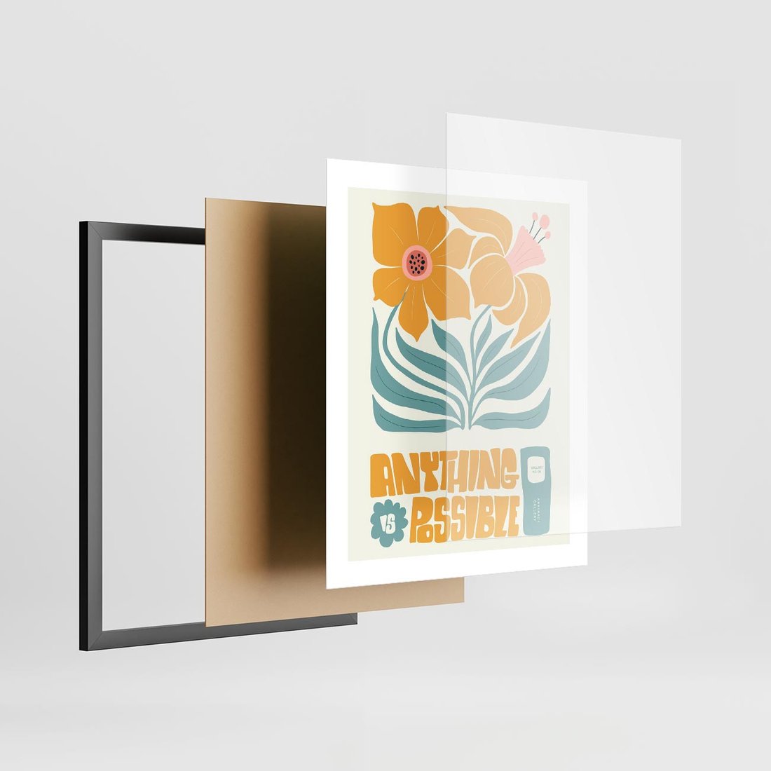 Ta nowoczesna sztuka przenosi nas w świat pastelowych marzeń, gdzie abstrakcyjne kwiaty tańczą z subtelnością. Wzbogacona wyrazistą typografią, tworzy kompozycję pełną piękna i wyobraźni.