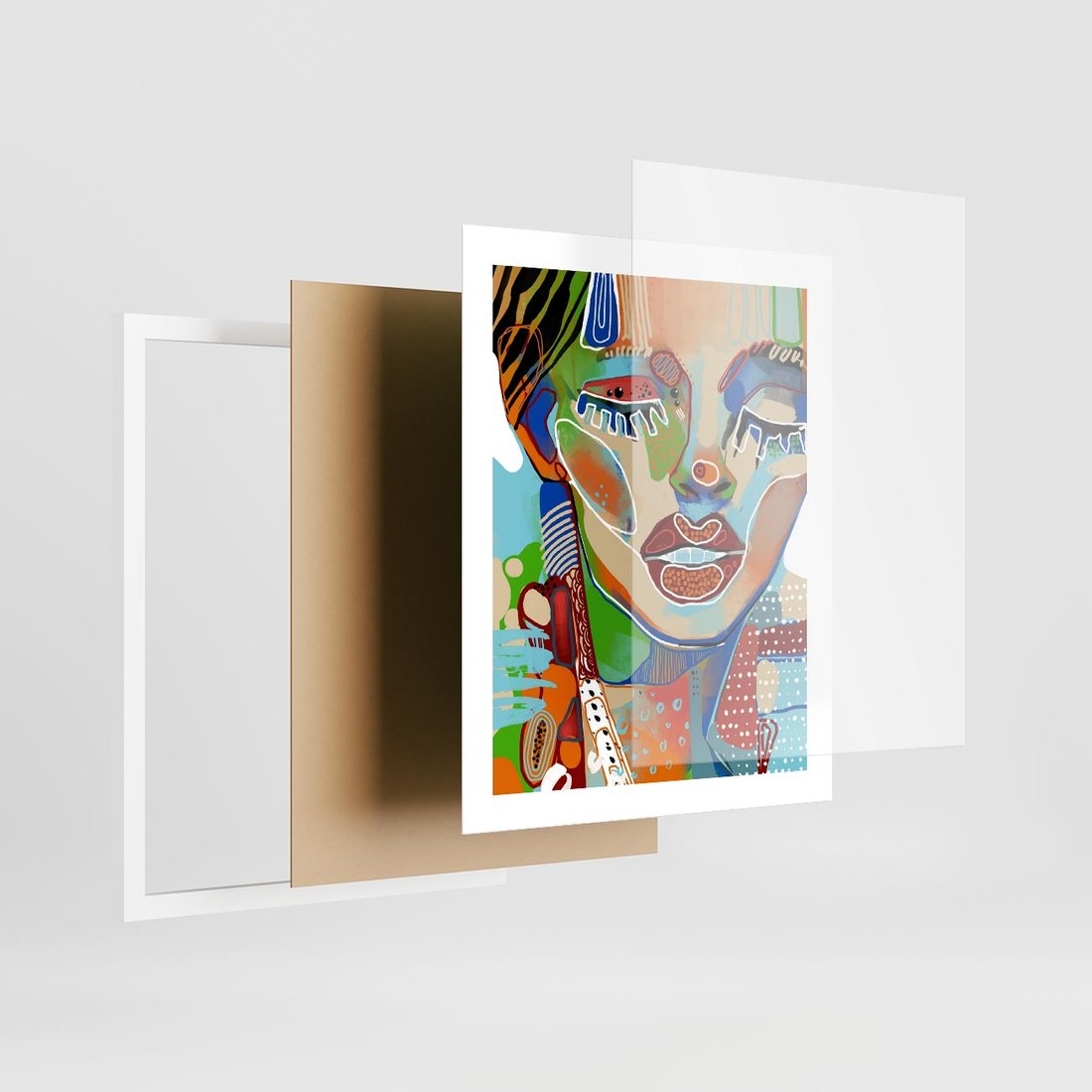 Abstrakcyjny portret kobiety emanuje ekspresją poprzez żywe kolory i wyrazistą twarz. Zamknięte oczy dodają tajemniczości, tworząc unikalną i fascynującą kompozycję.