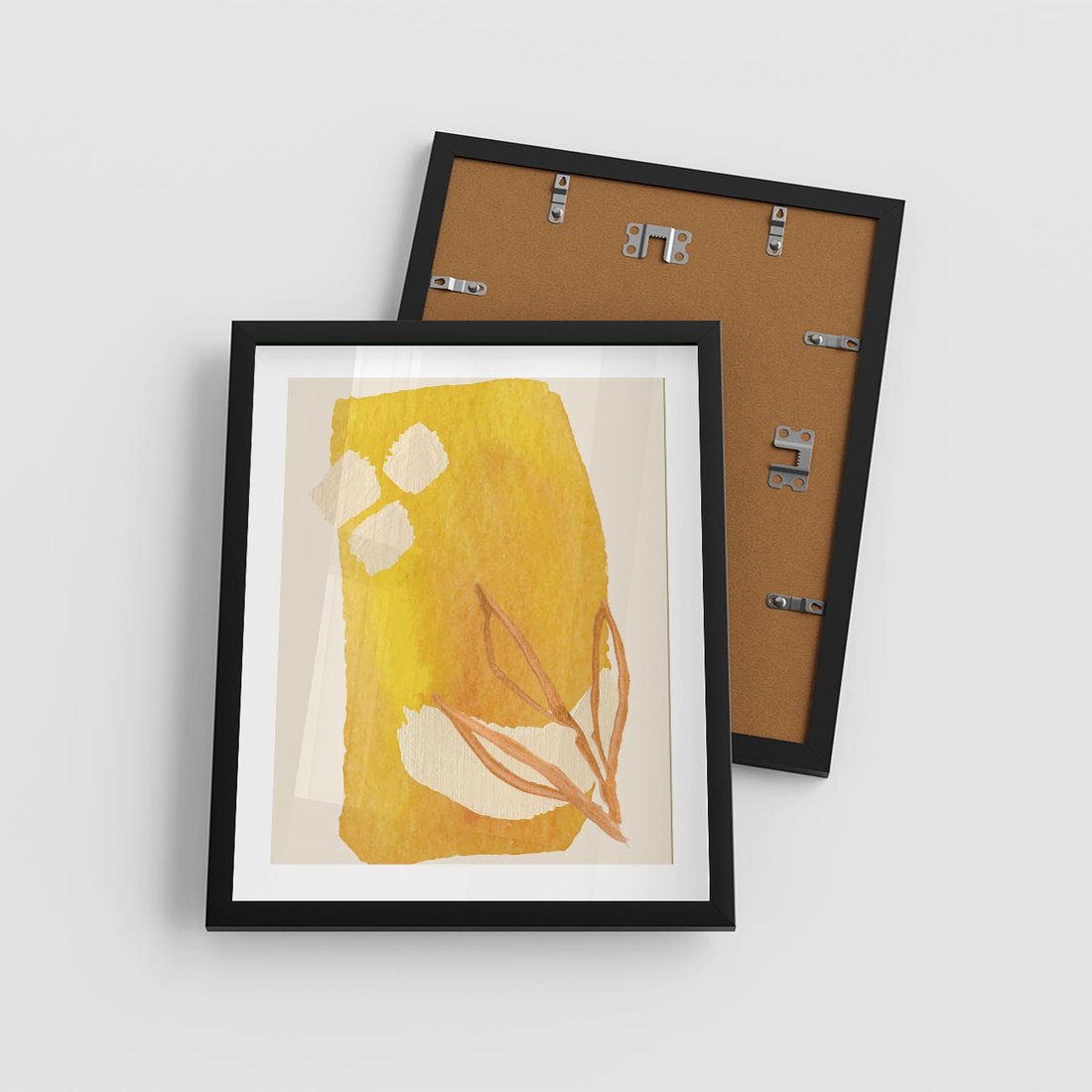 Nasz minimalistyczny plakat to abstrakcyjna żółta plama w akwarelowej technice, ozdobiona złotym liściem. To artystyczne połączenie przynosi energię i wyrafinowanie do Twojej przestrzeni, wprowadzając subtelny akcent natury i elegancji.